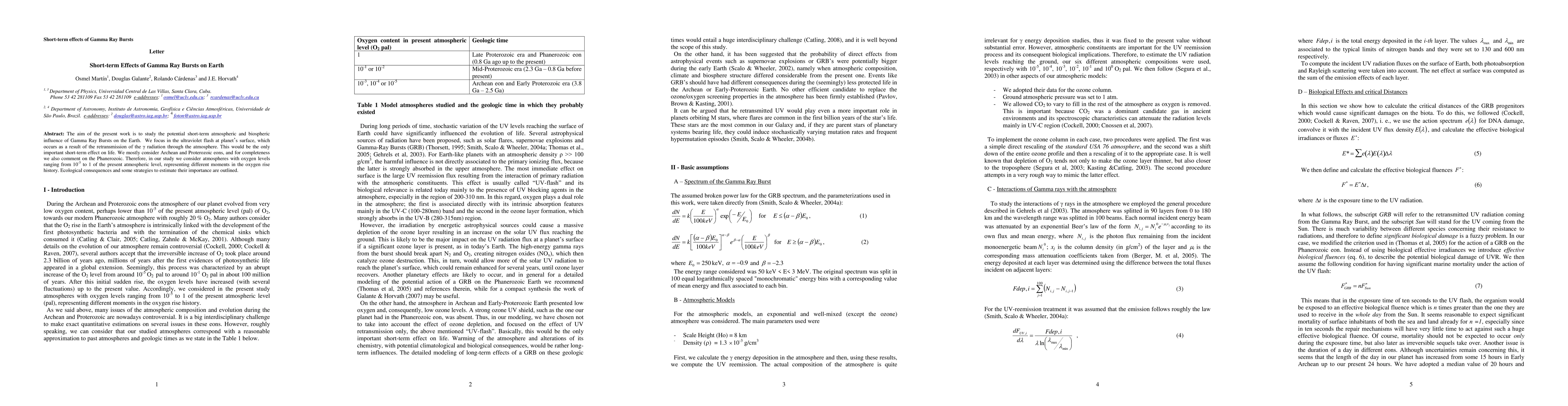 This study examines the potential short-term effects of gamma ray bursts on Earth's atmosphere and biosphere, focusing on ultraviolet flashes that could harm life. Researchers consider different oxygen levels in ancient atmospheres to estimate ecological consequences.