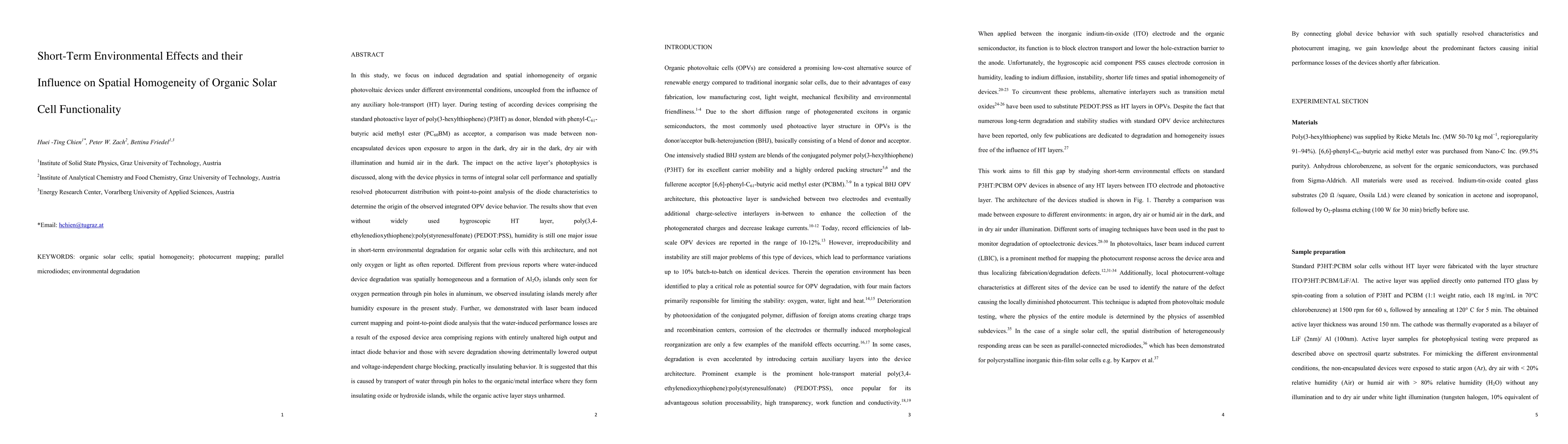 Here, we focus on induced degradation and spatial inhomogeneity of organic photovoltaic devices under different environmental conditions, uncoupled from the influence of a hole-transport (HT) layer. During testing of devices comprising the standard photoactive layer of P3HT as donor, blended with PCBM as acceptor, a comparison was made between the nonencapsulated devices upon exposure to dry air, dry air with illumination and humid air. The impact on the active layer's photophysics is discussed, along with the device physics in terms of integral solar cell performance and spatially resolved photocurrent distribution with point-to-point analysis of the diode characteristics to determine the origin of the observed behavior. The results show that even without the widely used hygroscopic HT layer, PEDOT:PSS, humidity is still a major factor in the short-term environmental degradation of organic solar cells with this architecture, and not only oxygen or light, as is often reported. Different from previous reports where water-induced device degradation was spatially homogeneous and formation of Al2O3 islands was only seen for oxygen permeation through pinholes in aluminum, we observed insulating islands merely after humidity exposure in the present study. Further, we demonstrated with laser beam induced current mapping and point-to-point diode analysis that the water-induced performance losses are a result of the exposed device area comprising regions with entirely unaltered high output and intact diode behavior and those with severe degradation showing detrimentally lowered output and voltage-independent charge blocking, which is essentially insulating behavior. It is suggested that this is caused by transport of water through pinholes to the organic/metal interface, where they form insulating oxide or hydroxide islands, while the organic active layer stays unharmed.