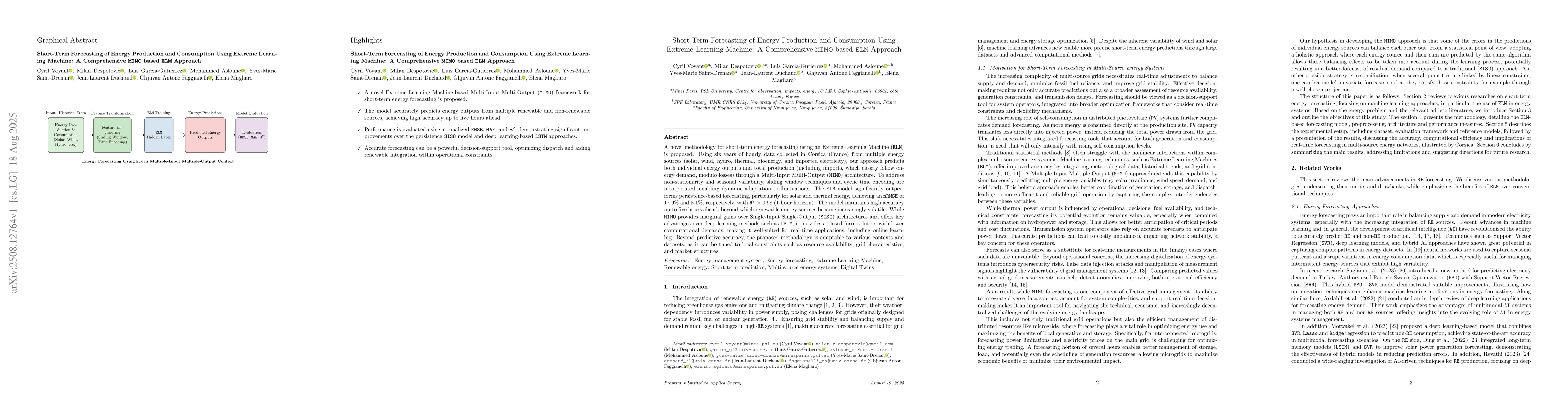 A novel methodology for short-term energy forecasting using an Extreme Learning Machine ($\mathtt{ELM}$) is proposed. Using six years of hourly data collected in Corsica (France) from multiple energy sources (solar, wind, hydro, thermal, bioenergy, and imported electricity), our approach predicts both individual energy outputs and total production (\cyr{including imports, which closely follow energy demand, modulo losses)} through a Multi-Input Multi-Output ($\mathtt{MIMO}$) architecture. To address non-stationarity and seasonal variability, sliding window techniques and cyclic time encoding are incorporated, enabling dynamic adaptation to fluctuations. The $\mathtt{ELM}$ model significantly outperforms persistence-based forecasting, particularly for solar and thermal energy, achieving an $\mathtt{nRMSE}$ of $17.9\%$ and $5.1\%$, respectively, with $\mathtt{R^2} > 0.98$ (1-hour horizon). The model maintains high accuracy up to five hours ahead, beyond which renewable energy sources become increasingly volatile. While $\mathtt{MIMO}$ provides marginal gains over Single-Input Single-Output ($\mathtt{SISO}$) architectures and offers key advantages over deep learning methods such as $\mathtt{LSTM}$, it provides a closed-form solution with lower computational demands, making it well-suited for real-time applications, including online learning. Beyond predictive accuracy, the proposed methodology is adaptable to various contexts and datasets, as it can be tuned to local constraints such as resource availability, grid characteristics, and market structures.