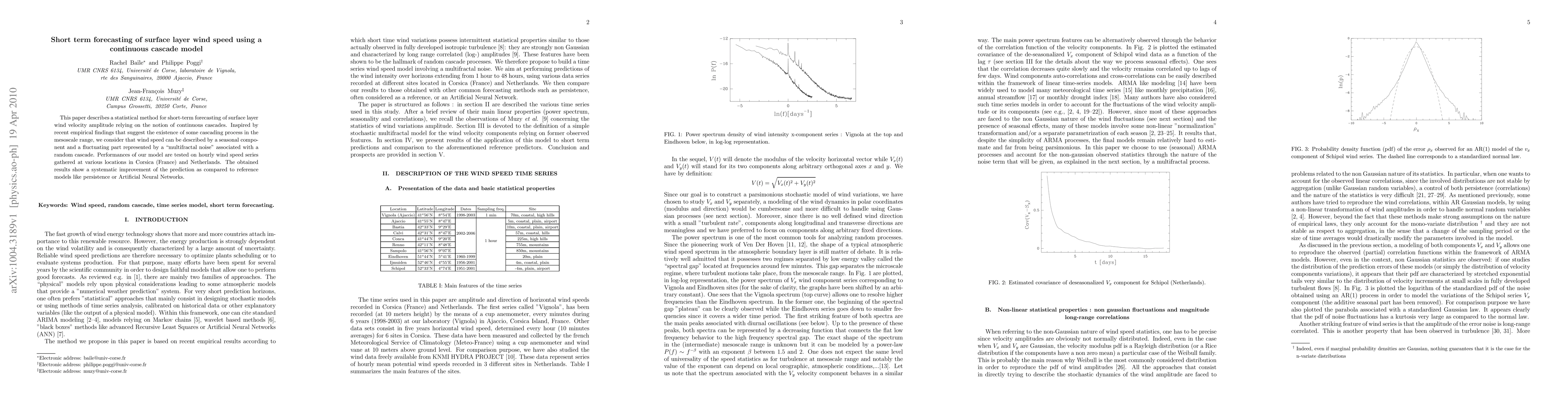 This paper proposes a statistical method for short-term wind speed forecasting using a continuous cascade model, showing improved performance over traditional methods through testing on Corsica and Netherlands wind data. The model combines a seasonal component with a multifractal noise representation of fluctuating wind speeds.