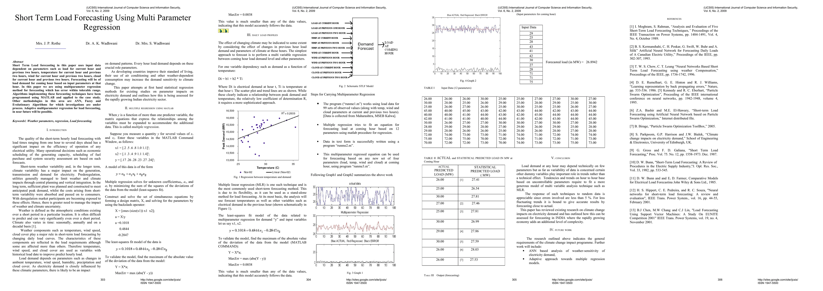 This paper employs multiparameter regression to forecast short-term electricity load demand, using parameters like current and past load, temperature, wind, and cloud cover. The method shows acceptable error rates, and MATLAB-based algorithms have been developed for implementation.