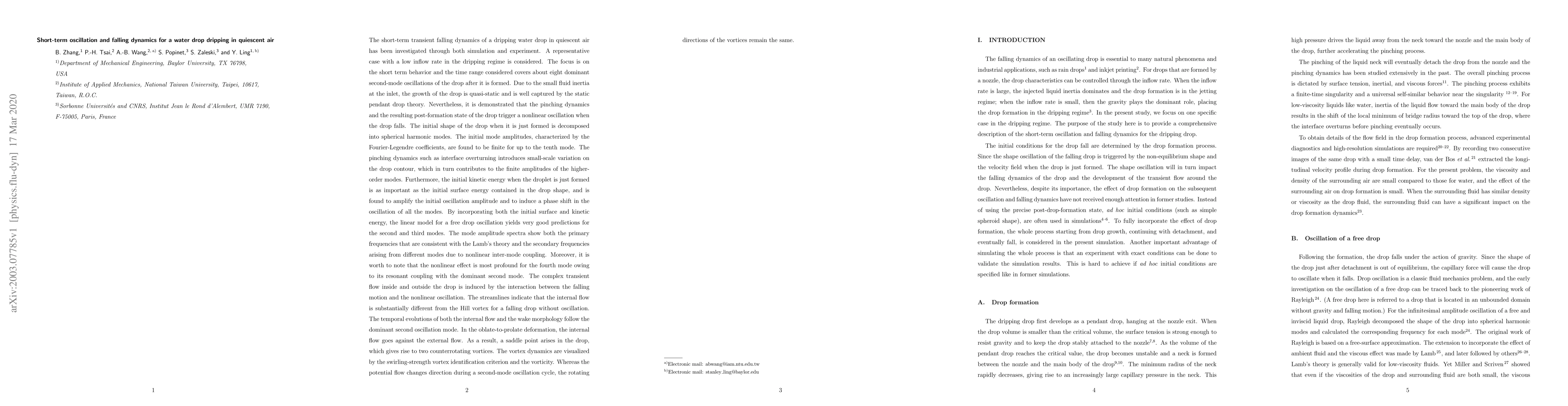 The short-term transient falling dynamics of a dripping water drop in quiescent air has been investigated through both simulation and experiment. The focus is on the short term behavior and the time range considered covers about eight dominant second-mode oscillations of the drop after it is formed. Due to the small fluid inertia the growth of the drop is quasi-static and is well captured by the static pendant drop theory. Nevertheless, the pinching dynamics and the resulting post-formation state of the drop trigger a nonlinear oscillation when the drop falls. The initial shape of the drop when it is just formed is decomposed into spherical harmonic modes. The pinching dynamics such as interface overturning introduces small-scale variation on the drop contour, which in turn contributes to the finite amplitudes of the higher-order modes. Furthermore, the initial kinetic energy when the droplet is just formed is as important as the initial surface energy contained in the drop shape, and is found to amplify the initial oscillation amplitude and to induce a phase shift in the oscillation of all the modes. By incorporating both the initial surface and kinetic energy, the linear model for a free drop oscillation yields very good predictions for the second and third modes. The mode amplitude spectra show both the primary frequencies that are consistent with the Lamb's theory and the secondary frequencies arising from different modes due to nonlinear inter-mode coupling. The complex transient flow inside and outside the drop is induced by the interaction between the falling motion and the nonlinear oscillation. The streamlines indicate that the internal flow is substantially different from the Hill vortex for a falling drop without oscillation. The temporal evolutions of both the internal flow and the wake morphology follow the dominant second oscillation mode.