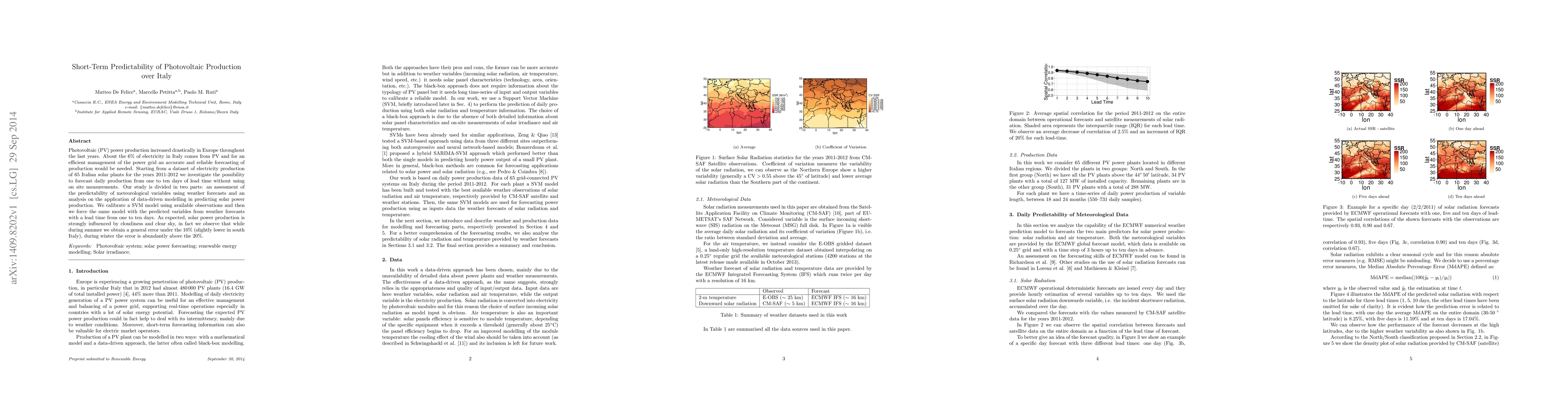 This study investigates the short-term predictability of photovoltaic production in Italy using weather forecasts without on-site measurements. The results show accurate predictions (error < 10%) during summer but significantly higher errors (error > 20%) during winter, highlighting the influence of cloudiness and clear skies on solar power production.
