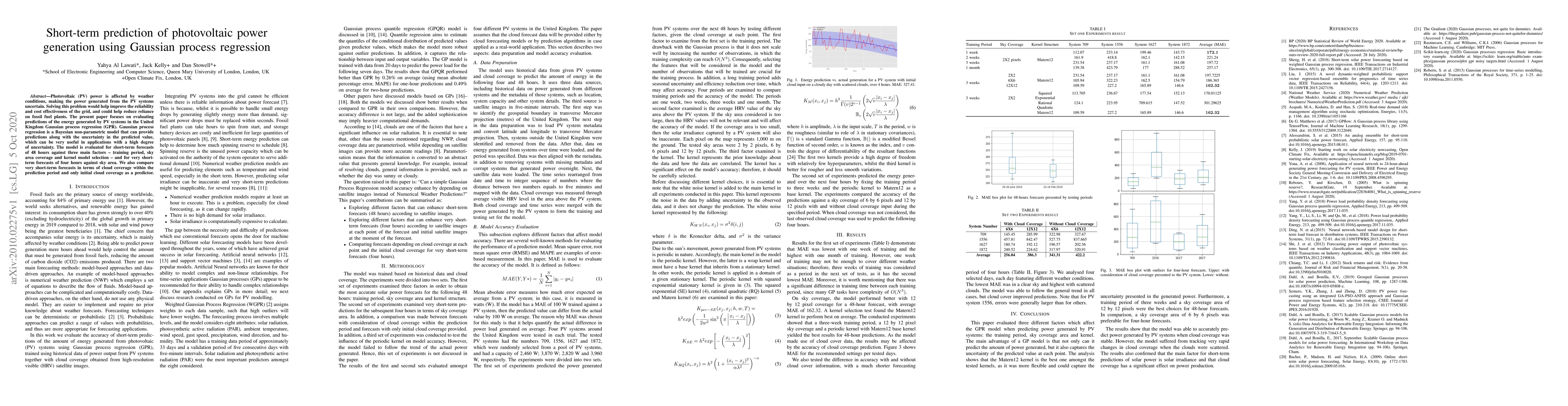 This paper evaluates the use of Gaussian process regression (GPR) to predict short-term photovoltaic power generation in the UK, focusing on the uncertainty inherent in weather-dependent PV outputs. The model's performance is assessed over 48-hour forecasts and compared against training period, sky area coverage, and kernel selection, highlighting its utility in high-uncertainty applications.