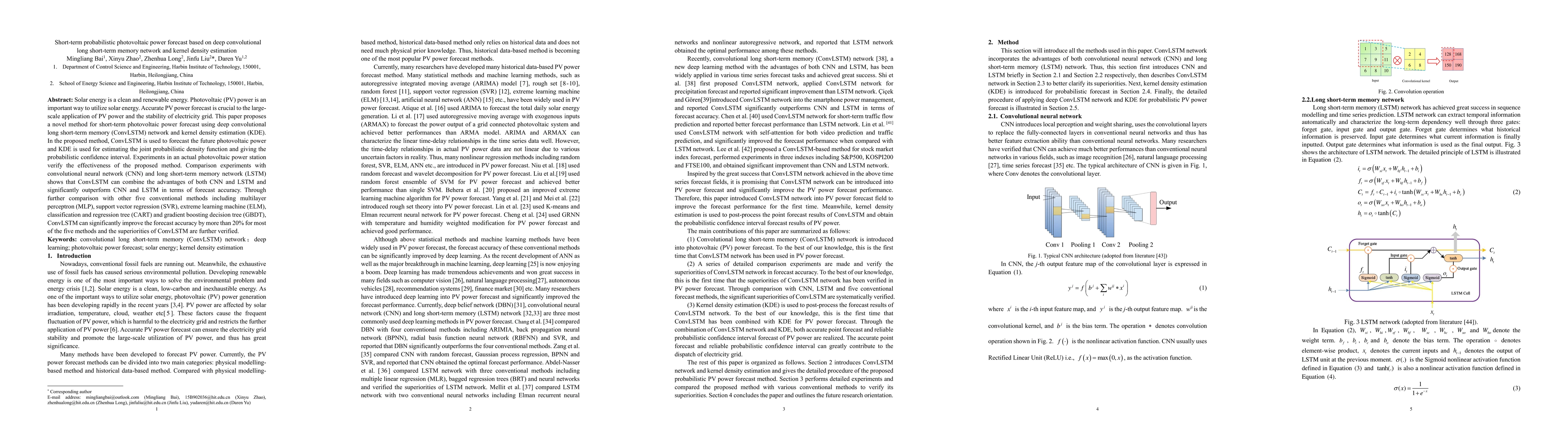 This paper proposes a novel method for short-term PV power forecasting using a deep convolutional long short-term memory network (ConvLSTM) and kernel density estimation (KDE). ConvLSTM outperforms conventional methods and significantly improves forecast accuracy by over 20% compared to five other conventional techniques.