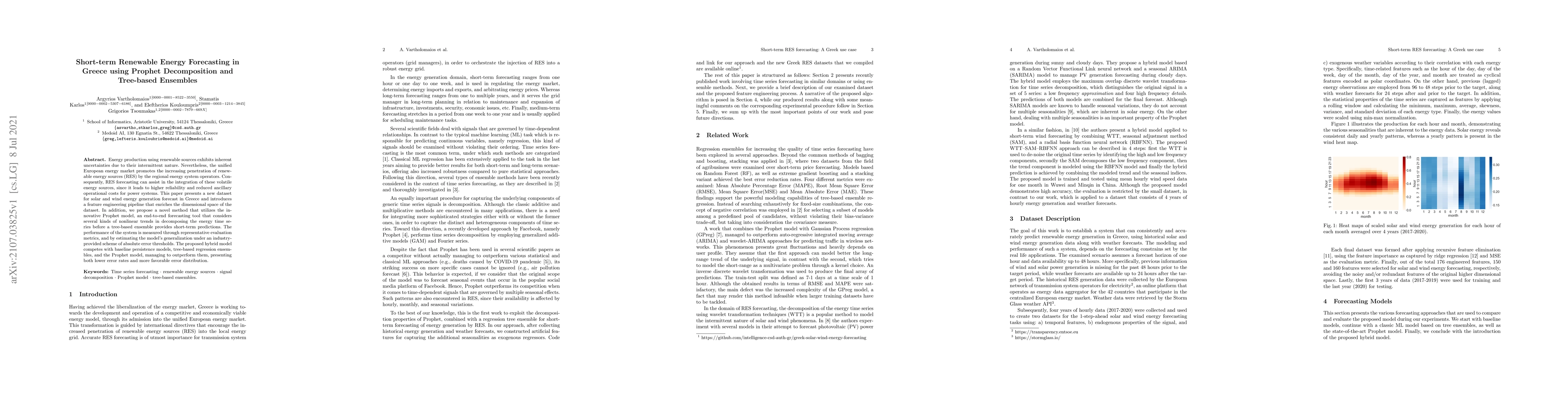 Energy production using renewable sources exhibits inherent uncertainties due to their intermittent nature. Nevertheless, the unified European energy market promotes the increasing penetration of renewable energy sources (RES) by the regional energy system operators. Consequently, RES forecasting can assist in the integration of these volatile energy sources, since it leads to higher reliability and reduced ancillary operational costs for power systems. This paper presents a new dataset for solar and wind energy generation forecast in Greece and introduces a feature engineering pipeline that enriches the dimensional space of the dataset. In addition, we propose a novel method that utilizes the innovative Prophet model, an end-to-end forecasting tool that considers several kinds of nonlinear trends in decomposing the energy time series before a tree-based ensemble provides short-term predictions. The performance of the system is measured through representative evaluation metrics, and by estimating the model's generalization under an industryprovided scheme of absolute error thresholds. The proposed hybrid model competes with baseline persistence models, tree-based regression ensembles, and the Prophet model, managing to outperform them, presenting both lower error rates and more favorable error distribution.