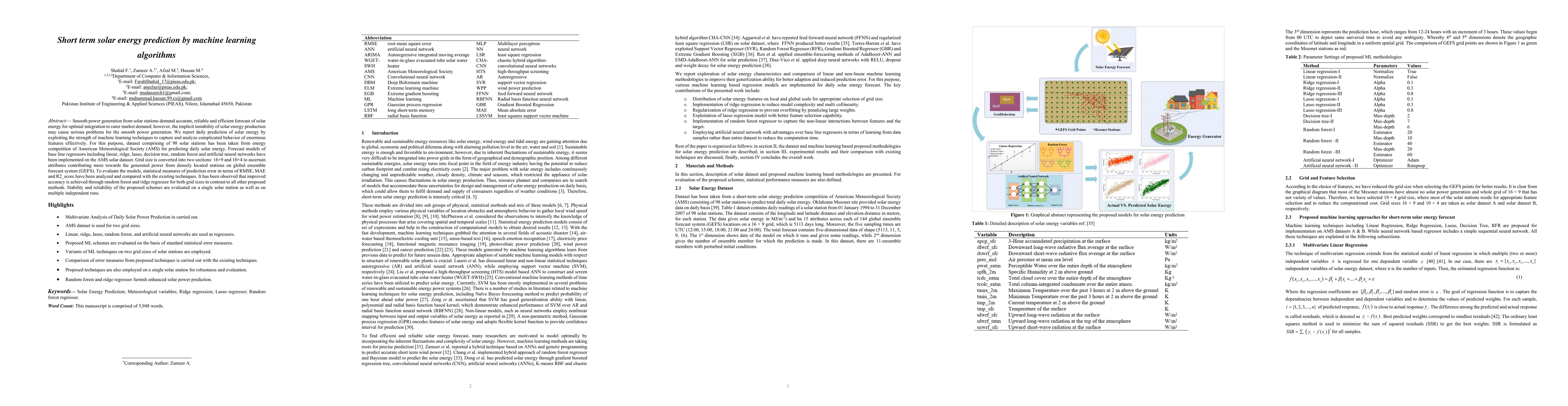 Smooth power generation from solar stations demand accurate, reliable and efficient forecast of solar energy for optimal integration to cater market demand; however, the implicit instability of solar energy production may cause serious problems for the smooth power generation. We report daily prediction of solar energy by exploiting the strength of machine learning techniques to capture and analyze complicated behavior of enormous features effectively. For this purpose, dataset comprising of 98 solar stations has been taken from energy competition of American Meteorological Society (AMS) for predicting daily solar energy. Forecast models of base line regressors including linear, ridge, lasso, decision tree, random forest and artificial neural networks have been implemented on the AMS solar dataset. Grid size is converted into two sections: 16x9 and 10x4 to ascertain attributes contributing more towards the generated power from densely located stations on global ensemble forecast system (GEFS). To evaluate the models, statistical measures of prediction error in terms of RMSE, MAE and R2_score have been analyzed and compared with the existing techniques. It has been observed that improved accuracy is achieved through random forest and ridge regressor for both grid sizes in contrast to all other proposed methods. Stability and reliability of the proposed schemes are evaluated on a single solar station as well as on multiple independent runs.