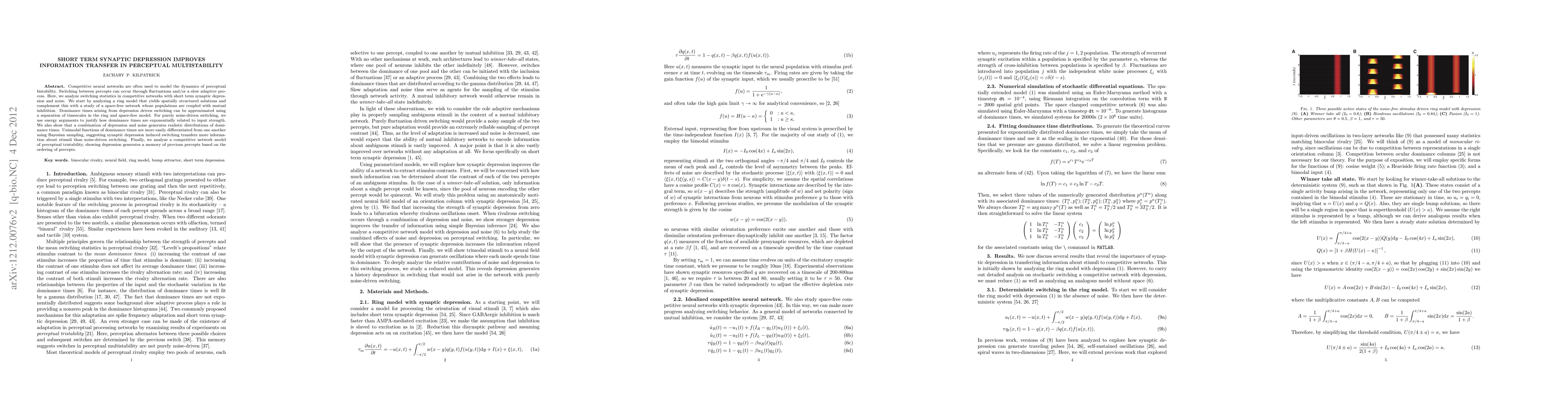 This paper investigates how short-term synaptic depression in neural networks enhances information transfer during perceptual multistability by analyzing switching dynamics in competitive networks with noise and depression. It finds that depression-induced switching provides more information about stimuli compared to noise-driven switching, and it also generates memory of previous percepts.