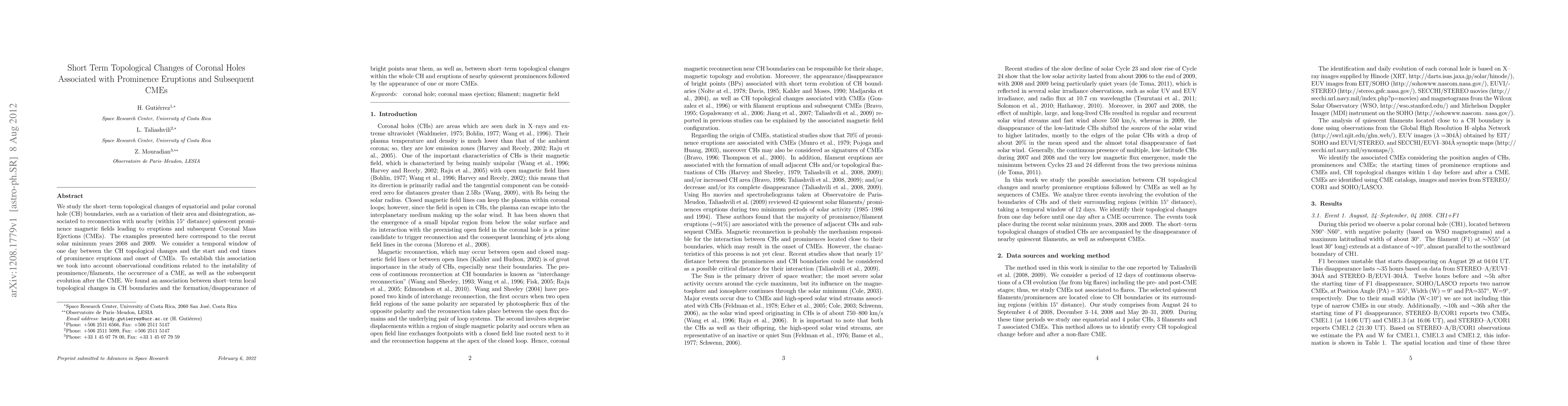We study the short--term topological changes of equatorial and polar coronal hole (CH) boundaries, such as a variation of their area and disintegration, associated to reconnection with nearby (within 15$^\circ$ distance) quiescent prominence magnetic fields leading to eruptions and subsequent Coronal Mass Ejections (CMEs). The examples presented here correspond to the recent solar minimum years 2008 and 2009. We consider a temporal window of one day between the CH topological changes and the start and end times of prominence eruptions and onset of CMEs. To establish this association we took into account observational conditions related to the instability of prominence/filaments, the occurrence of a CME, as well as the subsequent evolution after the CME. We found an association between short--term local topological changes in CH boundaries and the formation/disappearance of bright points near them, as well as, between short--term topological changes within the whole CH and eruptions of nearby quiescent prominences followed by the appearance of one or more CMEs.