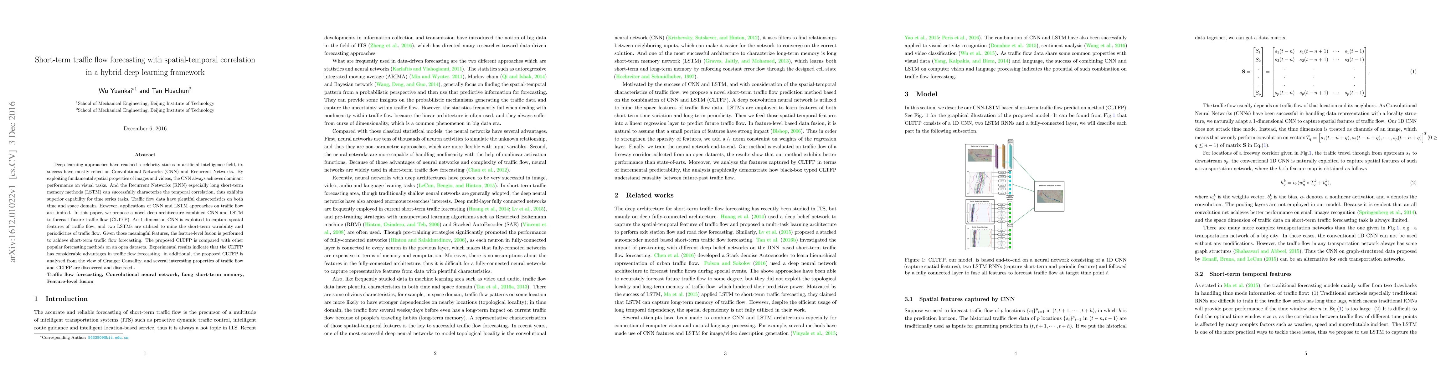 This paper proposes a hybrid deep learning framework combining CNN and LSTM to forecast short-term traffic flow, leveraging spatial features and temporal correlations. Experimental results show superior performance compared to other methods, highlighting the effectiveness of the proposed CLTFP model.