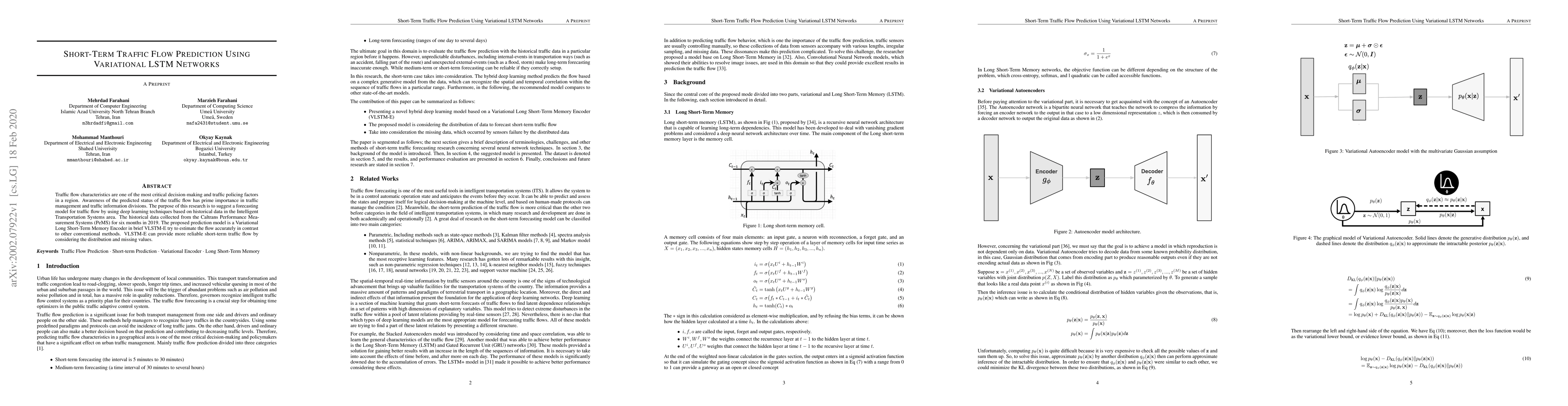 This research proposes a Variational Long Short-Term Memory Encoder (VLSTM-E) model for short-term traffic flow prediction using historical data from California's PeMS system. The VLSTM-E aims to provide more reliable forecasts compared to conventional methods by considering data distribution and missing values.