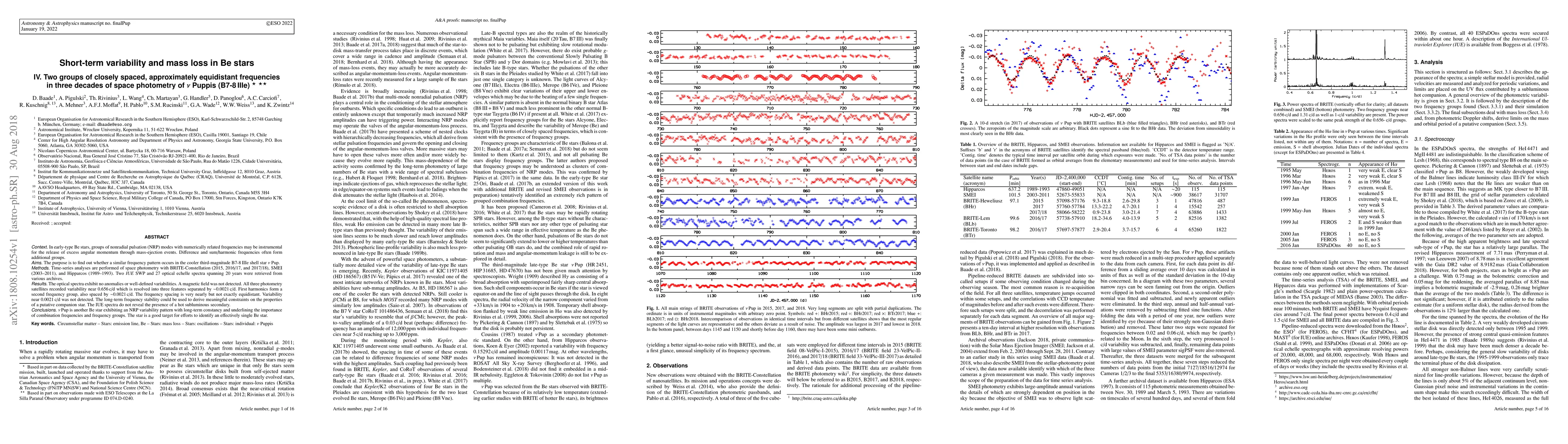 In early-type Be stars, groups of nonradial pulsation (NRP) modes with numerically related frequencies may be instrumental for the release of excess angular momentum through mass-ejection events. Difference and sum/harmonic frequencies often form additional groups. The goal of this study is to find out whether a similar frequency pattern occurs in the cooler third-magnitude B7-8\,IIIe shell star $\nu$ Pup. Time-series analyses are performed of space photometry with BRITE-Constellation (2015, 2016/17, and 2017/18), SMEI (2003--011), and Hipparcos (1989-1993). Two IUE SWP and 27 optical echelle spectra spanning 20 years were retrieved from various archives. The optical spectra exhibit no anomalies or well-defined variabilities. A magnetic field was not detected. All three photometry satellites recorded variability near 0.656 c/d which is resolved into three features separated by ~0.0021 c/d. First harmonics form a second frequency group, also spaced by ~0.0021 c/d. The frequency spacing is very nearly but not exactly equidistant. Variability near 0.0021 c/d was not detected. The long-term frequency stability could be used to derive meaningful constraints on the properties of a putative companion star. The IUE spectra do not reveal the presence of a hot subluminous secondary. $\nu$\,Pup is another Be star exhibiting an NRP variability pattern with long-term constancy and underlining the importance of combination frequencies and frequency groups. The star is a good target for efforts to identify an effectively single Be star.