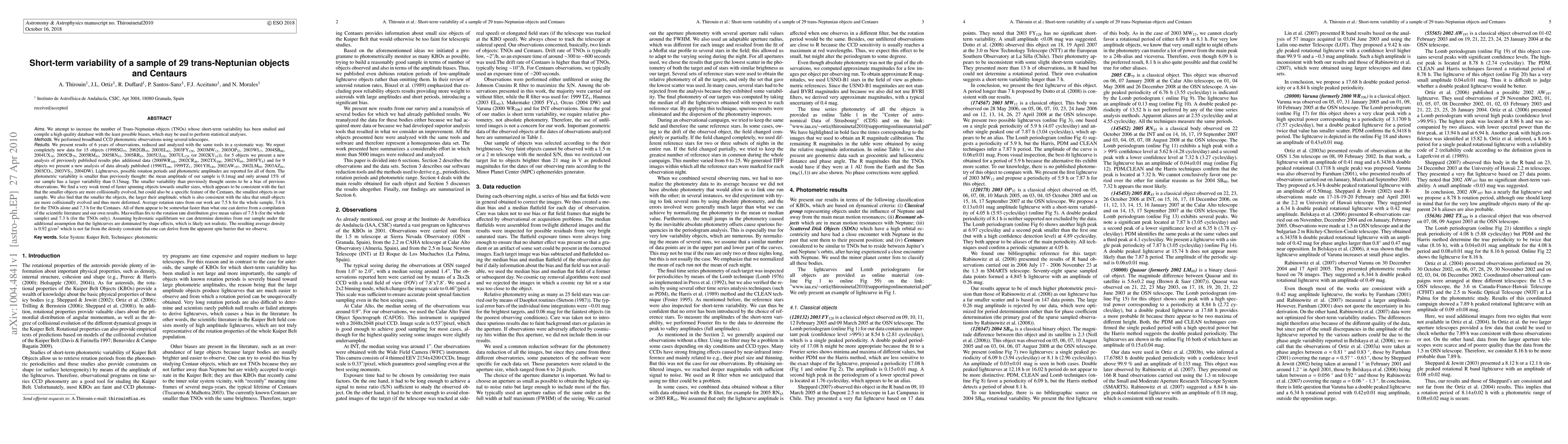 We present results of 6 years of observations, reduced and analyzed with the same tools in a systematic way. We report completely new data for 15 objects, for 5 objects we present a new analysis of previously published results plus additional data and for 9 objects we present a new analysis of data already published. Lightcurves, possible rotation periods and photometric amplitudes are reported for all of them. The photometric variability is smaller than previously thought: the mean amplitude of our sample is 0.1mag and only around 15% of our sample has a larger variability than 0.15mag. The smaller variability than previously thought seems to be a bias of previous observations. We find a very weak trend of faster spinning objects towards smaller sizes, which appears to be consistent with the fact that the smaller objects are more collisionally evolved, but could also be a specific feature of the Centaurs, the smallest objects in our sample. We also find that the smaller the objects, the larger their amplitude, which is also consistent with the idea that small objects are more collisionally evolved and thus more deformed. Average rotation rates from our work are 7.5h for the whole sample, 7.6h for the TNOs alone and 7.3h for the Centaurs. All of them appear to be somewhat faster than what one can derive from a compilation of the scientific literature and our own results. Maxwellian fits to the rotation rate distribution give mean values of 7.5h (for the whole sample) and 7.3h (for the TNOs only). Assuming hydrostatic equilibrium we can determine densities from our sample under the additional assumption that the lightcurves are dominated by shape effects, which is likely not realistic. The resulting average density is 0.92g/cm^3 which is not far from the density constraint that one can derive from the apparent spin barrier that we observe.