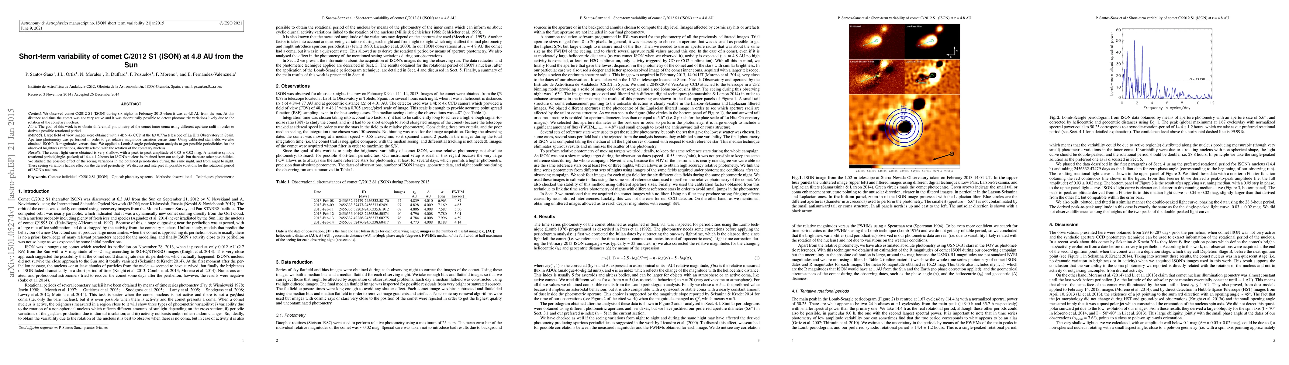The research observed comet C/2012 S1 (ISON) in February 2013 at 4.8 AU from the Sun, aiming to detect nucleus rotation-induced photometric variations. Using a 0.77m telescope, they derived a possible synodic rotational period of 14.4 ± 1.2 hours, though other solutions were discussed. Seeing variations did not affect the period determination.