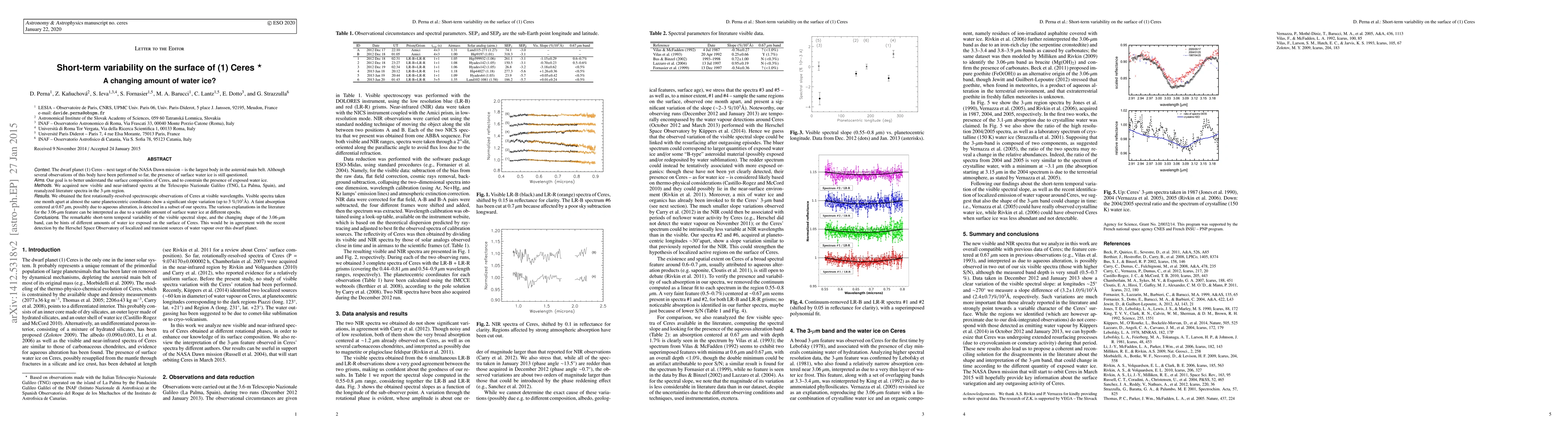 This study investigates the surface composition of Ceres using new visible and near-infrared spectra, revealing significant short-term variability in the spectral slope and the 3.06-µm band, suggesting fluctuating amounts of exposed water ice on Ceres' surface. These findings support the presence of transient water vapor sources detected by the Herschel Space Observatory.