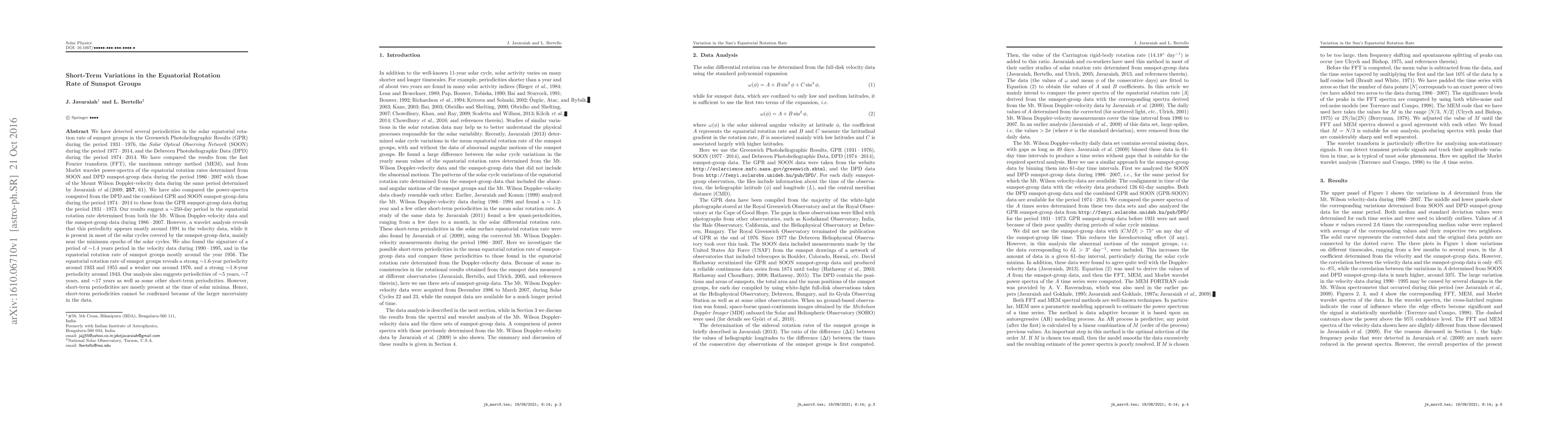 This study identifies various periodicities in the equatorial rotation rate of sunspot groups from 1931-2014, revealing a dominant ~250-day period, especially around 1991, and other periodicities of ~1.4 years, ~1.6-1.8 years, ~5 years, ~7 years, and ~17 years, mostly near solar minima. However, the short-term periodicities are uncertain due to data variability.