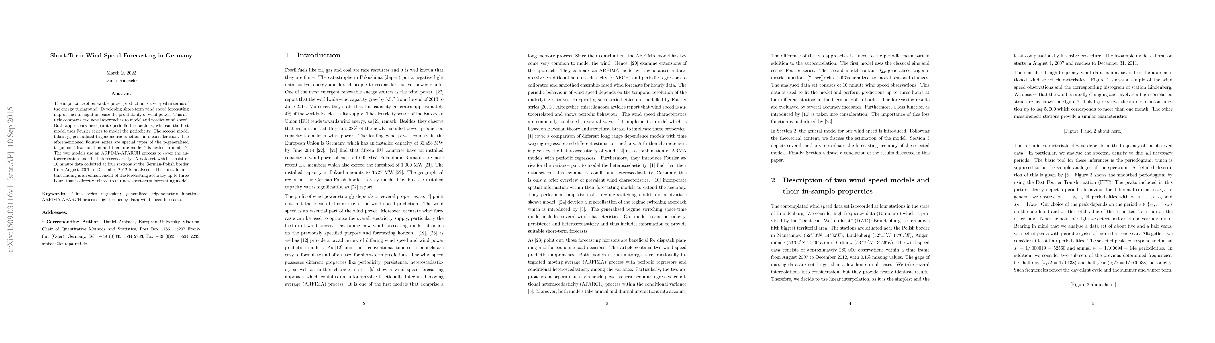 The importance of renewable power production is a set goal in terms of the energy turnaround. Developing short-term wind speed forecasting improvements might increase the profitability of wind power. This article compares two novel approaches to model and predict wind speed. Both approaches incorporate periodic interactions, whereas the first model uses Fourier series to model the periodicity. The second model takes $l_{2,p}$ generalised trigonometric functions into consideration. The aforementioned Fourier series are special types of the p-generalised trigonometrical function and therefore model 1 is nested in model 2. The two models use an ARFIMA-APARCH process to cover the autocorrelation and the heteroscedasticity. A data set which consist of 10 minute data collected at four stations at the German-Polish border from August 2007 to December 2012 is analysed. The most important finding is an enhancement of the forecasting accuracy up to three hours that is directly related to our new short-term forecasting model.