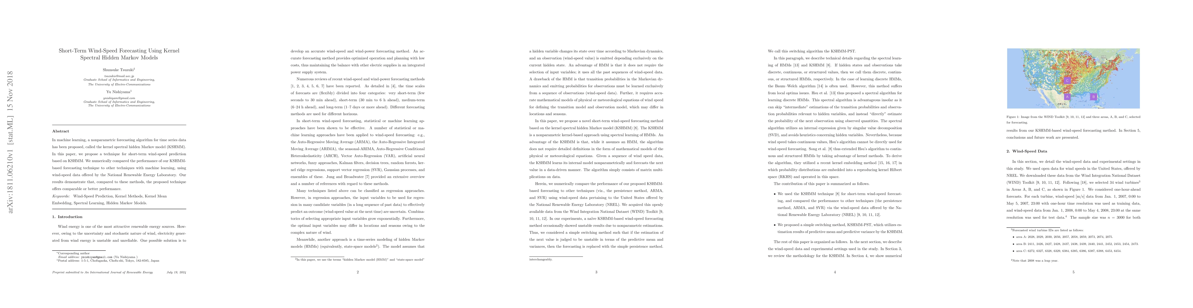 This paper proposes a kernel spectral hidden Markov model (KSHMM) for short-term wind-speed forecasting, demonstrating its performance through comparison with other machine learning techniques using data from the National Renewable Energy Laboratory, showing comparable or superior results.