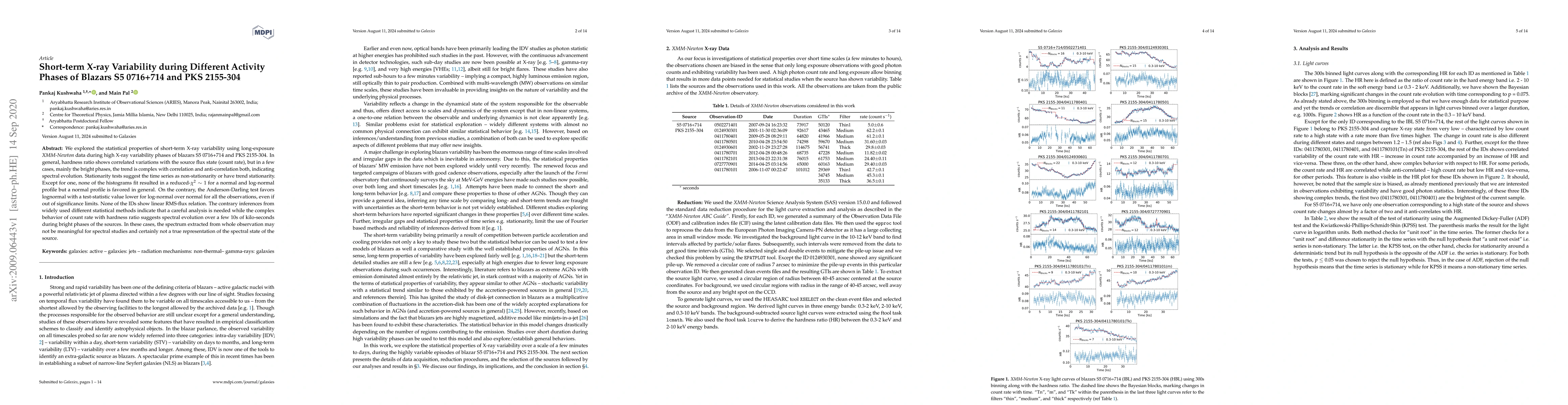 This study, using XMM-Newton data, analyzed short-term X-ray variability in blazars S5 0716+714 and PKS 2155-304 during high variability phases. It found complex relationships between count rate and hardness ratio, suggesting spectral evolution in bright phases. Statistical tests indicated non-stationarity in time series, with a general preference for normal over log-normal distribution in histograms, contrary to Anderson-Darling test results. No linear RMS-flux relation was observed, emphasizing the need for careful analysis in spectral studies during bright source phases.