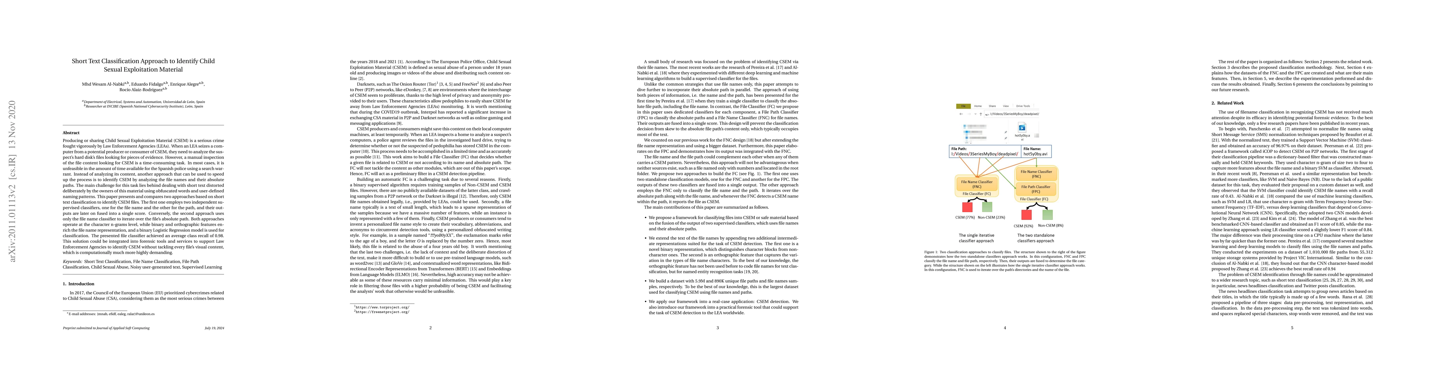Producing or sharing Child Sexual Exploitation Material (CSEM) is a serious crime fought vigorously by Law Enforcement Agencies (LEAs). When an LEA seizes a computer from a potential producer or consumer of CSEM, they need to analyze the suspect's hard disk's files looking for pieces of evidence. However, a manual inspection of the file content looking for CSEM is a time-consuming task. In most cases, it is unfeasible in the amount of time available for the Spanish police using a search warrant. Instead of analyzing its content, another approach that can be used to speed up the process is to identify CSEM by analyzing the file names and their absolute paths. The main challenge for this task lies behind dealing with short text distorted deliberately by the owners of this material using obfuscated words and user-defined naming patterns. This paper presents and compares two approaches based on short text classification to identify CSEM files. The first one employs two independent supervised classifiers, one for the file name and the other for the path, and their outputs are later on fused into a single score. Conversely, the second approach uses only the file name classifier to iterate over the file's absolute path. Both approaches operate at the character n-grams level, while binary and orthographic features enrich the file name representation, and a binary Logistic Regression model is used for classification. The presented file classifier achieved an average class recall of 0.98. This solution could be integrated into forensic tools and services to support Law Enforcement Agencies to identify CSEM without tackling every file's visual content, which is computationally much more highly demanding.