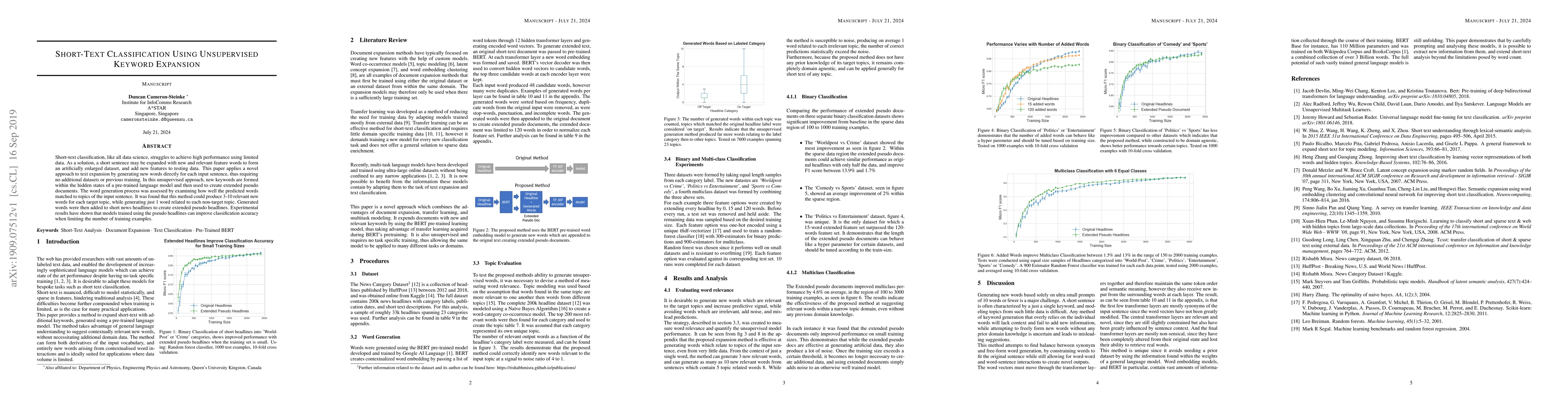 This paper proposes an unsupervised method for short-text classification that expands sentences with relevant keywords generated from a pre-trained language model, enhancing dataset size without additional data. Experimental results show improved classification accuracy using these expanded, pseudo headlines.