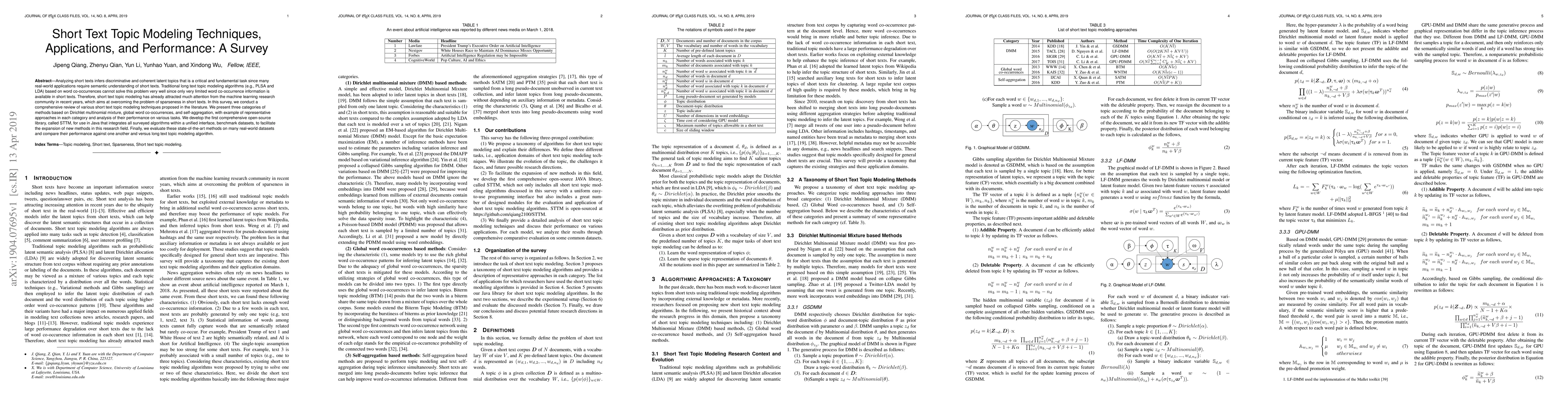 This paper surveys short text topic modeling techniques, categorizing methods based on Dirichlet multinomial mixture, global word co-occurrences, and self-aggregation. It introduces an open-source library, STTM, integrating these algorithms, and evaluates their performance on various datasets.