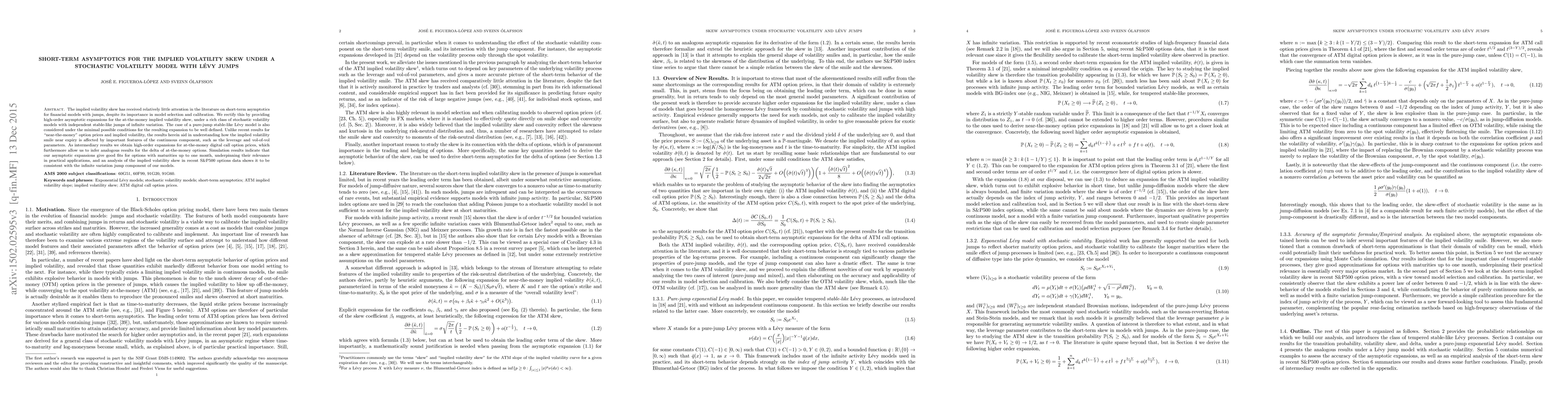 This paper provides high-order asymptotic expansions for the at-the-money implied volatility skew under stochastic volatility models with Lévy jumps, particularly focusing on infinite variation jumps. It also yields analogous results for at-the-money digital call option prices and delta, and shows the practical relevance of the expansions through simulations and S&P500 options data analysis.