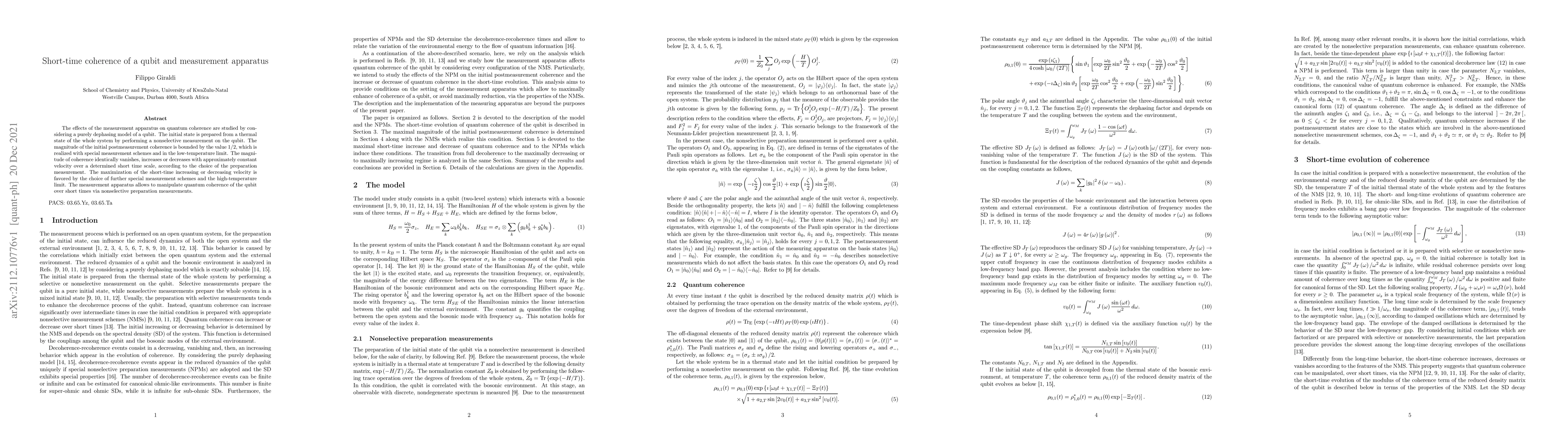 This paper investigates how measurement apparatus affects quantum coherence in a qubit using a dephasing model. It finds that the initial coherence after measurement is bounded by $1/2$, and coherence can either vanish, increase, or decrease at a constant rate over short times, depending on the measurement scheme and temperature.