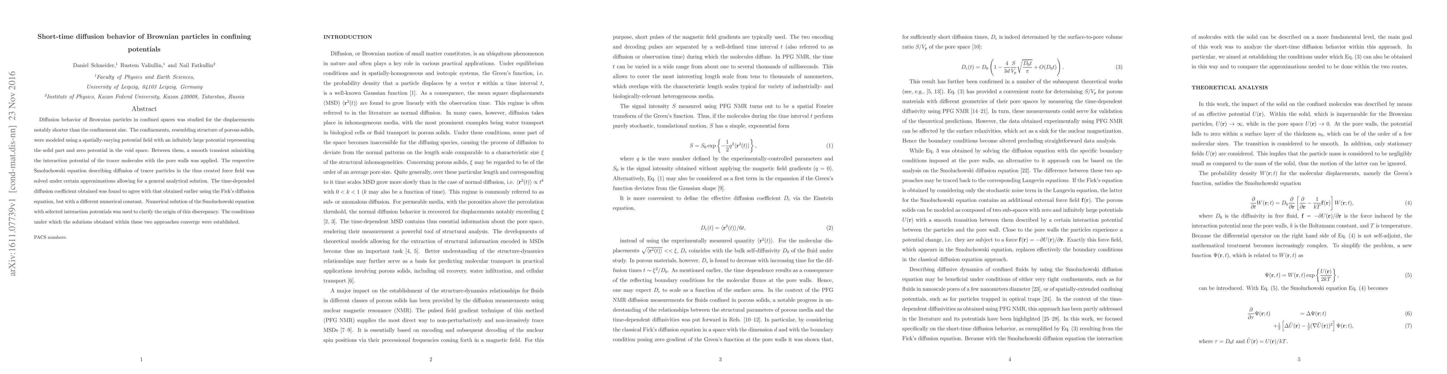 Diffusion behavior of Brownian particles in confined spaces was studied for the displacements notably shorter than the confinement size. The confinements, resembling structure of porous solids, were modeled using a spatially-varying potential field with an infinitely large potential representing the solid part and zero potential in the void space. Between them, a smooth transient mimicking the interaction potential of the tracer molecules with the pore walls was applied. The respective Smoluchowski equation describing diffusion of tracer particles in the thus created force field was solved under certain approximations allowing for a general analytical solution. The time-depended diffusion coefficient obtained was found to agree with that obtained earlier using the Fick's diffusion equation, but with a different numerical constant. Numerical solution of the Smoluchowski equation with selected interaction potentials was used to clarify the origin of this discrepancy. The conditions under which the solutions obtained within these two approaches converge were established.