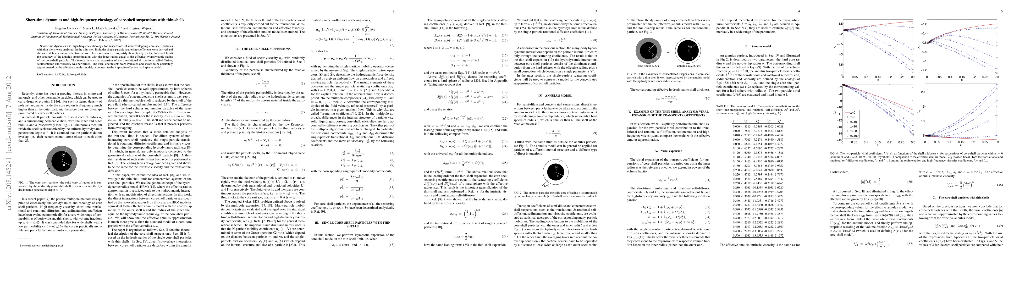 Short-time dynamics and high-frequency rheology for suspensions of non-overlapping core-shell particles with thin shells were analyzed. In the thin-shell limit, the single-particle scattering coefficients were derived and shown to define a unique effective radius. This result was used to justify theoretically (in the thin-shell limit) the accuracy of the annulus approximation with the inner radius equal to the effective hydrodynamic radius of the core-shell particle. The two-particle virial expansion of the translational & rotational self-diffusion, sedimentation and viscosity was performed. The virial coefficients were evaluated and shown to be accurately approximated by the effective annulus model, in contrast to the imprecise effective hard sphere model.