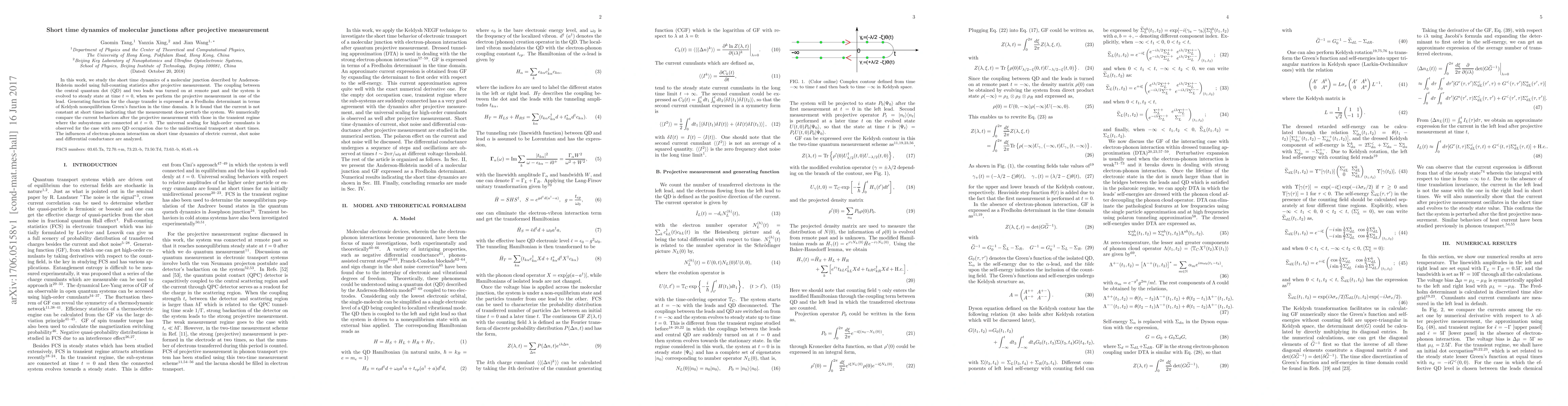 In this work, we study the short time dynamics of a molecular junction described by Anderson-Holstein model using full-counting statistics after projective measurement. The coupling between the central quantum dot (QD) and two leads was turned on at remote past and the system is evolved to steady state at time $t=0$, when we perform the projective measurement in one of the lead. Generating function for the charge transfer is expressed as a Fredholm determinant in terms of Keldysh nonequilibrium Green's function in the time domain. It is found that the current is not constant at short times indicating that the measurement does perturb the system. We numerically compare the current behaviors after the projective measurement with those in the transient regime where the subsystems are connected at $t=0$. The universal scaling for high-order cumulants is observed for the case with zero QD occupation due to the unidirectional transport at short times. The influences of electron-phonon interaction on short time dynamics of electric current, shot noise and differential conductance are analyzed.