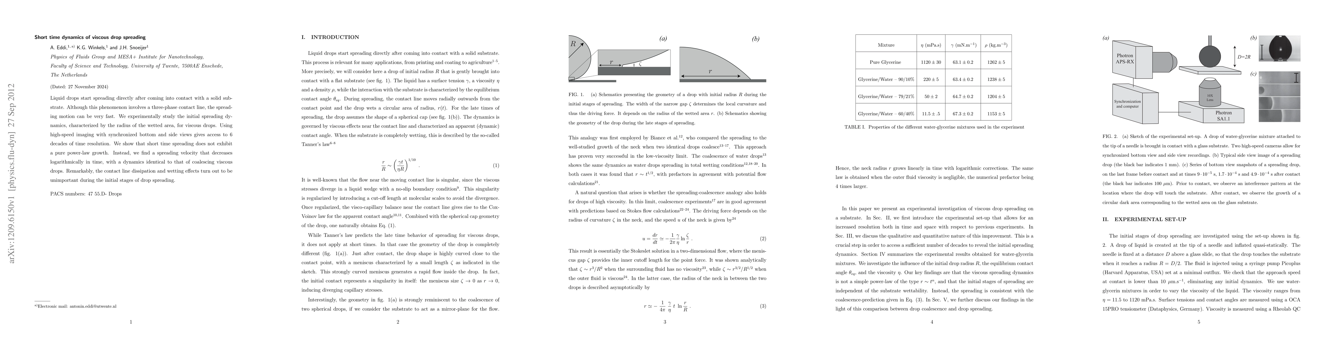 This study experimentally investigates the initial dynamics of viscous drop spreading on a solid substrate using high-speed imaging, revealing that spreading velocity decreases logarithmically over time rather than following a pure power-law. The research highlights that contact line dissipation and wetting effects are negligible during the early stages of spreading.