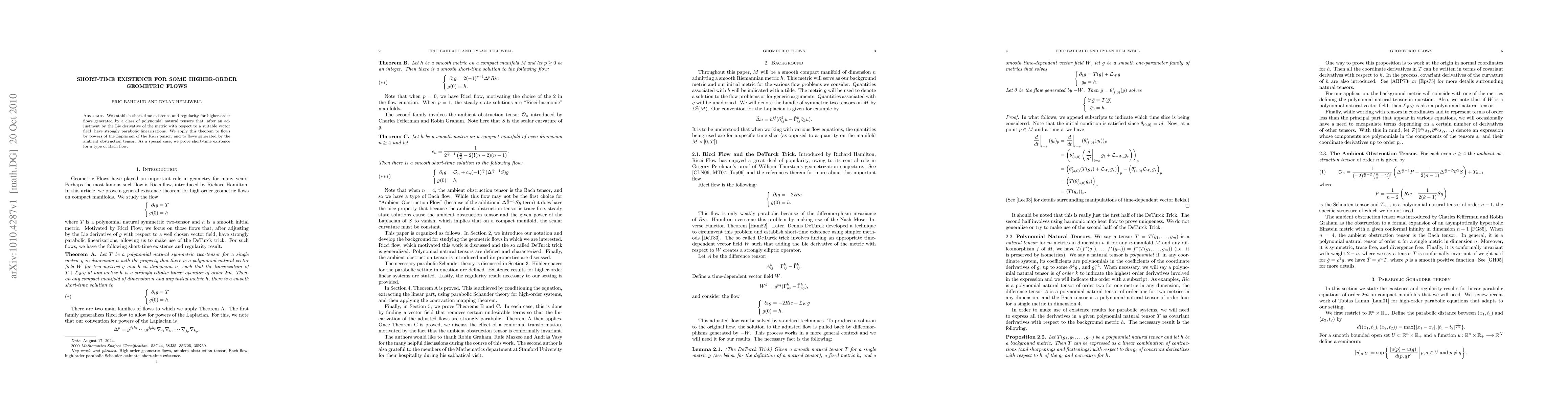 This paper establishes short-time existence and regularity for higher-order geometric flows driven by polynomial natural tensors with strongly parabolic linearizations. It applies these results to flows involving powers of the Laplacian of the Ricci tensor and the ambient obstruction tensor, including a special case for Bach flow.