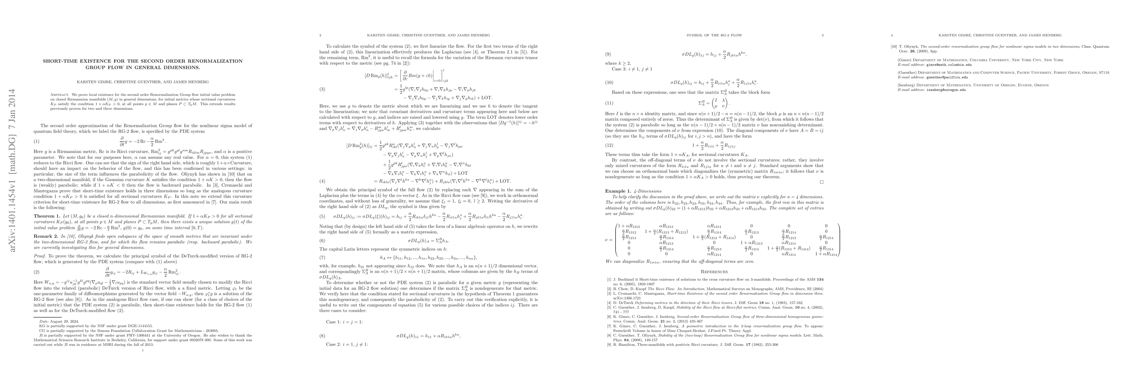 This paper proves local existence for the second order Renormalization Group flow on closed Riemannian manifolds in any dimension, provided the initial metrics satisfy the condition $1+\alpha K_P > 0$ at all points and planes. This extends earlier results to dimensions beyond two and three.