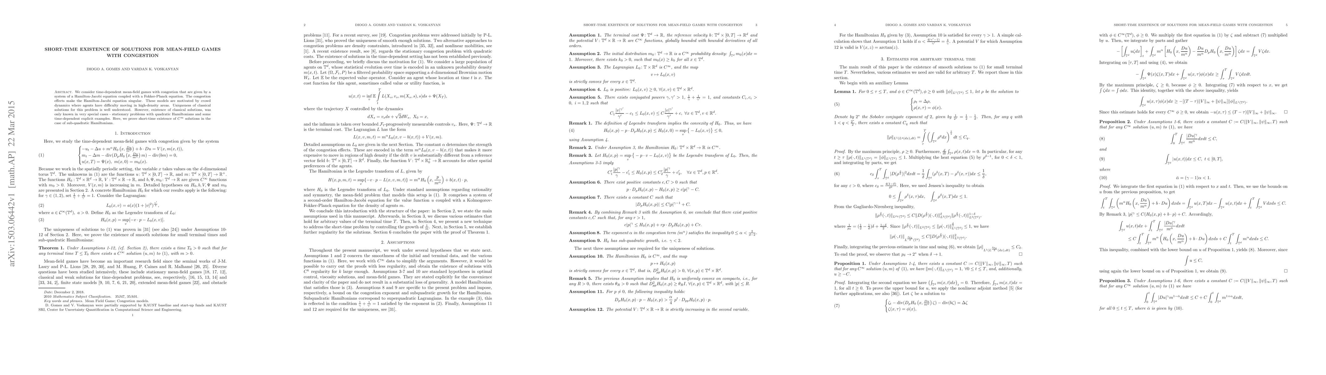 This paper proves short-time existence of smooth solutions for time-dependent mean-field games with congestion, addressing the singular Hamilton-Jacobi equation coupled with a Fokker-Planck equation motivated by crowd dynamics. Prior existence results were limited, but this work extends the existence to sub-quadratic Hamiltonians.