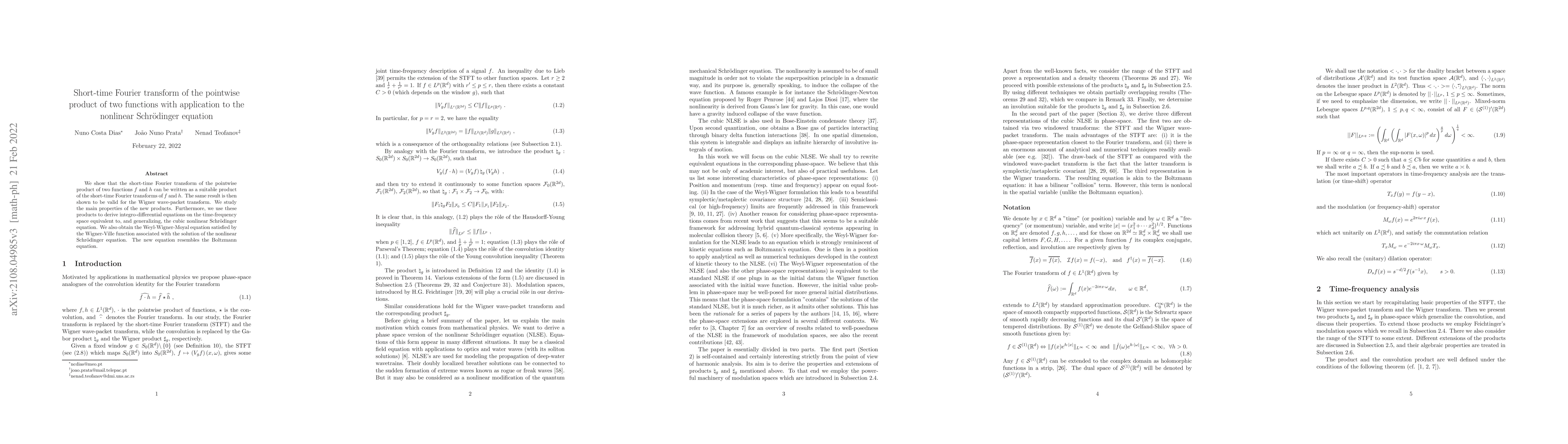 We show that the short-time Fourier transform of the pointwise product of two functions $f$ and $h$ can be written as a suitable product of the short-time Fourier transforms of $f$ and $h$. The same result is then shown to be valid for the Wigner wave-packet transform. We study the main properties of the new products. We then use these products to derive integro-differential equations on the time-frequency space equivalent to, and generalizing, the cubic nonlinear Schr\"odinger equation. We also obtain the Weyl-Wigner-Moyal equation satisfied by the Wigner-Ville function associated with the solution of the nonlinear Schr\"odinger equation. The new equation resembles the Boltzmann equation.