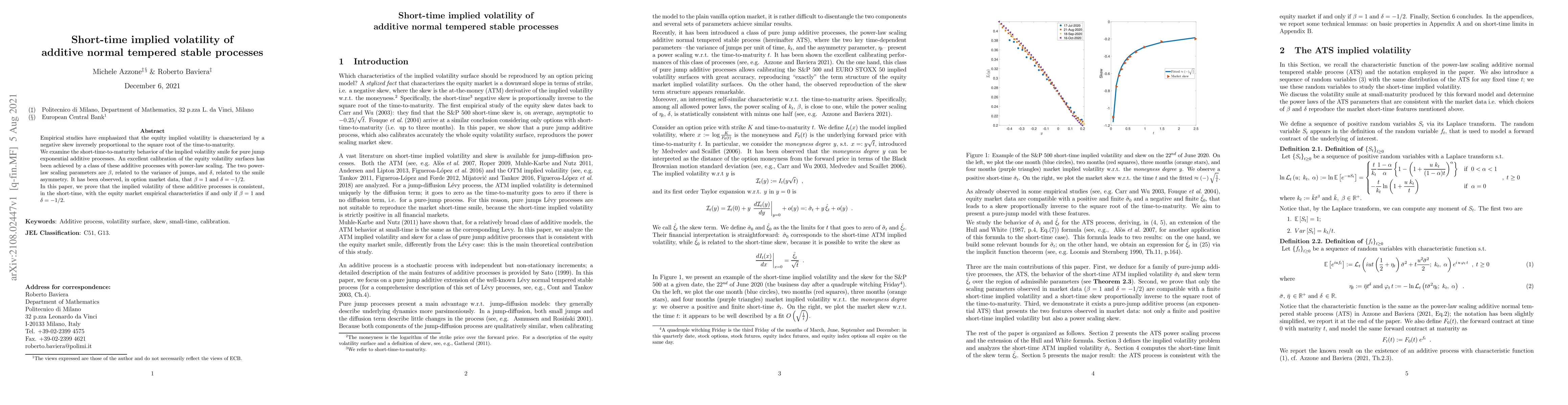 This paper investigates the short-time behavior of implied volatility for additive normal tempered stable processes, showing that the empirical characteristics of equity market data are accurately modeled when the parameters $\beta=1$ and $\delta=-1/2$. The study confirms the consistency of these processes in capturing the negative skewness of implied volatility smiles.