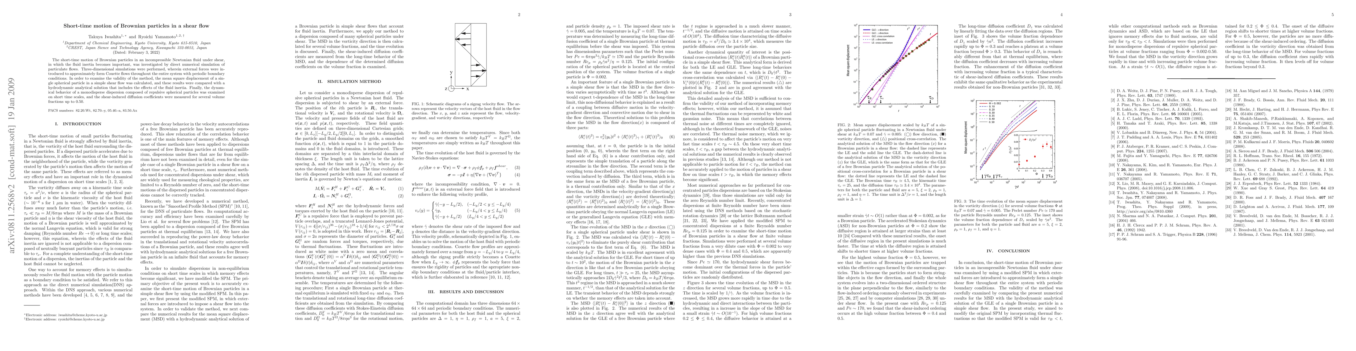 This paper investigates the short-time motion of Brownian particles in shear flow using three-dimensional simulations, comparing results with hydrodynamic analytical solutions to validate the method. It also measures shear-induced diffusion coefficients for monodisperse particle dispersions at various volume fractions.