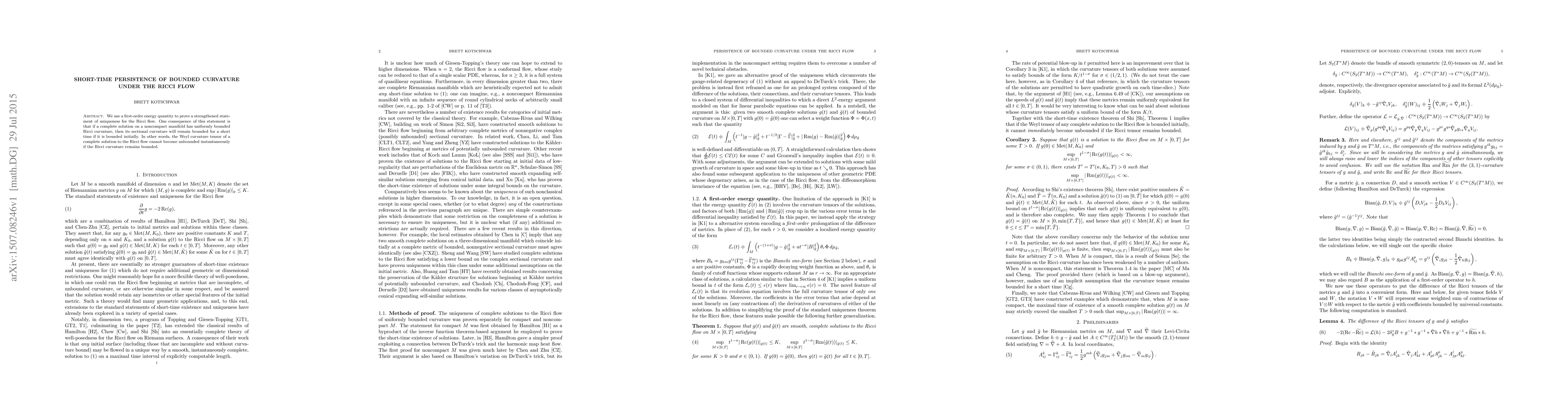 We use a first-order energy quantity to prove a strengthened statement of uniqueness for the Ricci flow. One consequence of this statement is that if a complete solution on a noncompact manifold has uniformly bounded Ricci curvature, then its sectional curvature will remain bounded for a short time if it is bounded initially. In other words, the Weyl curvature tensor of a complete solution to the Ricci flow cannot become unbounded instantaneously if the Ricci curvature remains bounded.