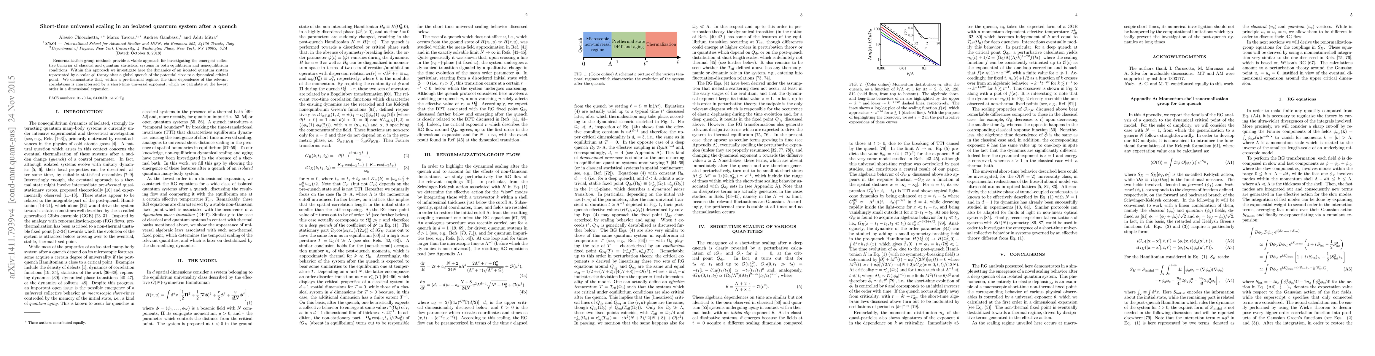 This paper uses renormalization-group methods to study the dynamics of an isolated quantum system, specifically a scalar $\phi^4$ theory, after a global quench. It reveals a short-time universal scaling behavior in the system's correlations during a pre-thermal regime, calculated at the lowest order in a dimensional expansion.
