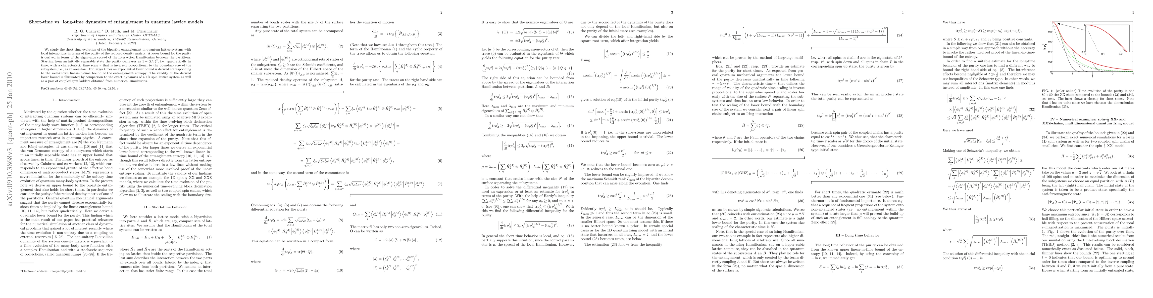 This paper studies how entanglement in quantum lattice models evolves over time, finding that it decreases quadratically at short times and exponentially at long times, with a characteristic time scale inversely proportional to the boundary size of the subsystem.