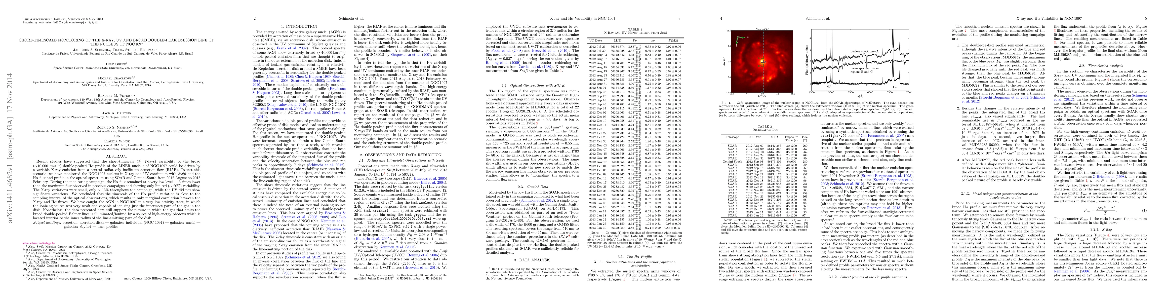 This study monitored the NGC1097 nucleus for short timescales to investigate the variability of its broad double-peaked H$\alpha$ emission, finding minimal changes in X-ray and UV emissions. The results suggest the H$\alpha$ profile variations are closely tied to the observation intervals, indicating a weak ionizing source in a low activity state.