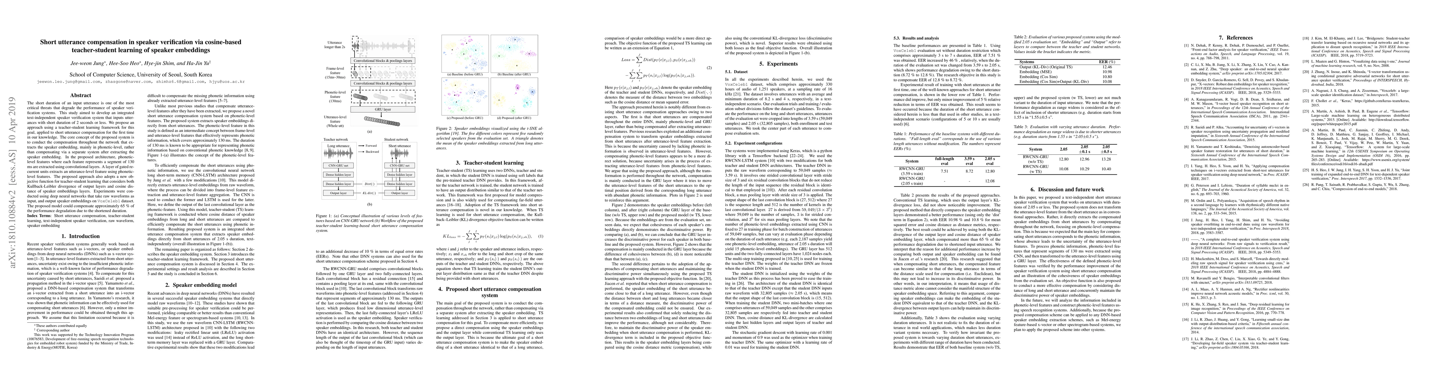 The short duration of an input utterance is one of the most critical threats that degrade the performance of speaker verification systems. This study aimed to develop an integrated text-independent speaker verification system that inputs utterances with short duration of 2 seconds or less. We propose an approach using a teacher-student learning framework for this goal, applied to short utterance compensation for the first time in our knowledge. The core concept of the proposed system is to conduct the compensation throughout the network that extracts the speaker embedding, mainly in phonetic-level, rather than compensating via a separate system after extracting the speaker embedding. In the proposed architecture, phonetic-level features where each feature represents a segment of 130 ms are extracted using convolutional layers. A layer of gated recurrent units extracts an utterance-level feature using phonetic-level features. The proposed approach also adopts a new objective function for teacher-student learning that considers both Kullback-Leibler divergence of output layers and cosine distance of speaker embeddings layers. Experiments were conducted using deep neural networks that take raw waveforms as input, and output speaker embeddings on VoxCeleb1 dataset. The proposed model could compensate approximately 65 \% of the performance degradation due to the shortened duration.