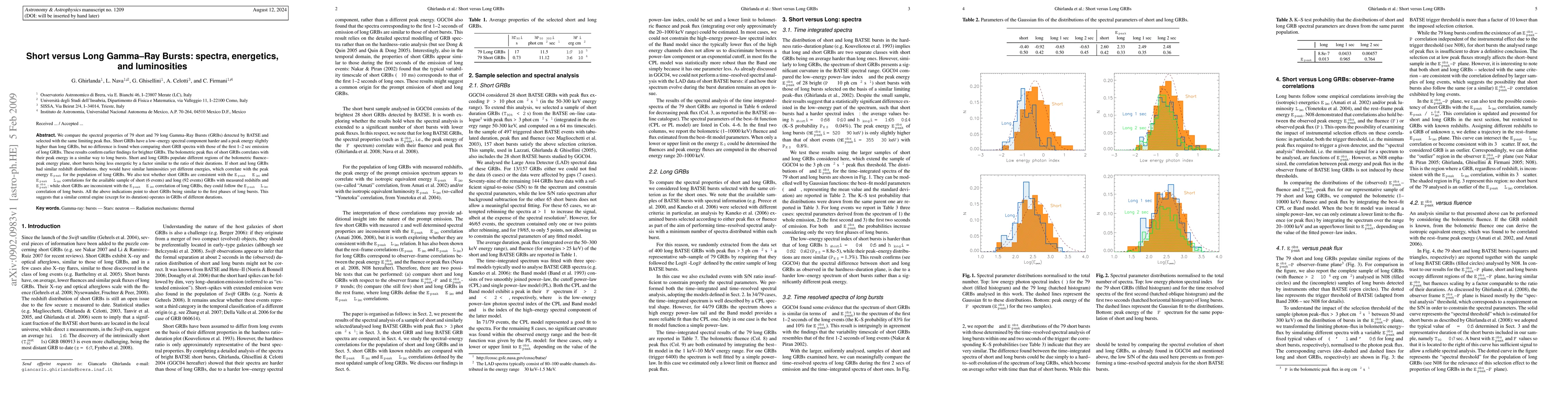 We compare the spectral properties of 79 short and 79 long Gamma-Ray Bursts (GRBs) detected by BATSE and selected with the same limiting peak flux. Short GRBs have a low-energy spectral component harder and a peak energy slightly higher than long GRBs, but no difference is found when comparing short GRB spectra with those of the first 1-2 sec emission of long GRBs. These results confirm earlier findings for brighter GRBs. The bolometric peak flux of short GRBs correlates with their peak energy in a similar way to long bursts. Short and long GRBs populate different regions of the bolometric fluence-peak energy plane, short bursts being less energetic by a factor similar to the ratio of their durations. If short and long GRBs had similar redshift distributions, they would have similar luminosities yet different energies, which correlate with the peak energy E_peak for the population of long GRBs. We also test whether short GRBs are consistent with the E_peak-E_iso and E_peak-L_iso correlations for the available sample of short (6 events) and long (92 events) GRBs with measured redshifts and E_peak,obs: while short GRBs are inconsistent with the E_peak-E_iso correlation of long GRBs, they could follow the E_peak-L_iso correlation of long bursts. All the above indications point to short GRBs being similar to the first phases of long bursts. This suggests that a similar central engine (except for its duration) operates in GRBs of different durations.