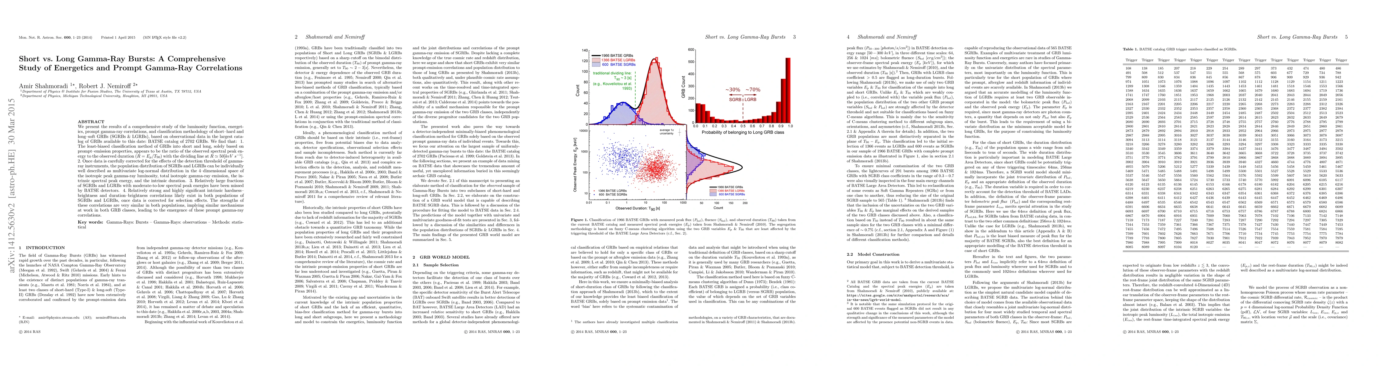 We present the results of a comprehensive study of the luminosity function, energetics, prompt gamma-ray correlations, and classification methodology of short-hard and long-soft GRBs (SGRBs and LGRBs), based on observational data in the largest catalog of GRBs available to this date: BATSE catalog of 2702 GRBs. We find that: 1. The least-biased classification method of GRBs into short and long, solely based on prompt-emission properties, appears to be the ratio of the observed spectral peak energy to the observed duration ($R=E_p/T_{90}$) with the dividing line at $R\simeq50[keV~s^{-1}]$. 2. Once data is carefully corrected for the effects of the detection threshold of gamma-ray instruments, the population distribution of SGRBs and LGRBs can be individually well described as multivariate log-normal distribution in the $4$--dimensional space of the isotropic peak gamma-ray luminosity, total isotropic gamma-ray emission, the intrinsic spectral peak energy, and the intrinsic duration. 3. Relatively large fractions of SGRBs and LGRBs with moderate-to-low spectral peak energies have been missed by BATSE detectors. 4. Relatively strong and highly significant intrinsic hardness--brightness and duration--brightness correlations likely exist in both populations of SGRBs and LGRBs, once data is corrected for selection effects. The strengths of these correlations are very similar in both populations, implying similar mechanisms at work in both GRB classes, leading to the emergence of these prompt gamma-ray correlations.