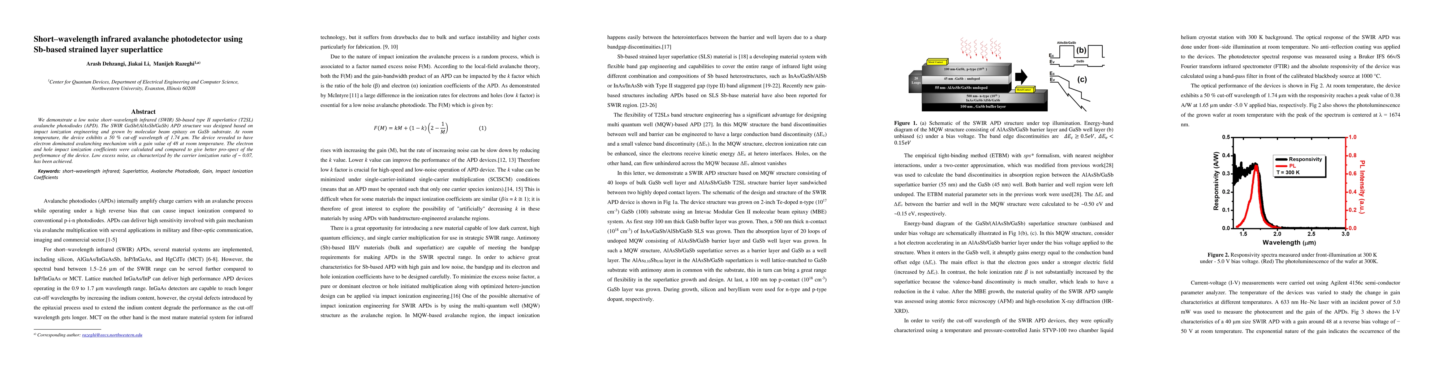 This paper demonstrates a low-noise short wavelength infrared avalanche photodetector using Sb-based strained layer superlattice, achieving a 50% cut-off wavelength of 1.74 microns at room temperature, with an electron dominated avalanching mechanism and a gain of 48, and low excess noise.