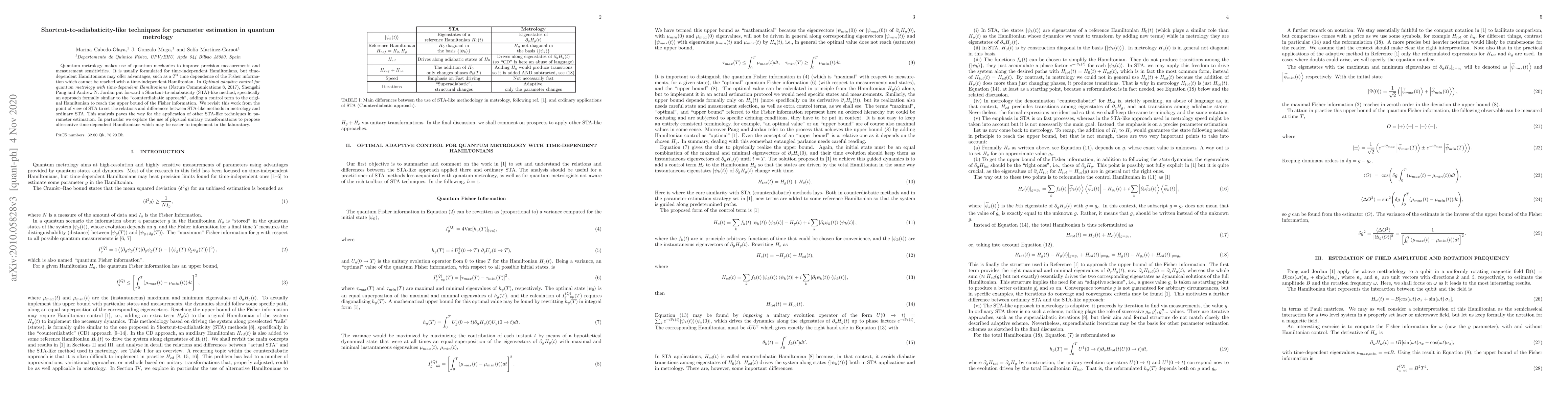 Quantum metrology makes use of quantum mechanics to improve precision measurements and measurement sensitivities. It is usually formulated for time-independent Hamiltonians but time-dependent Hamiltonians may offer advantages, such as a $T^4$ time dependence of the Fisher information which cannot be reached with a time-independent Hamiltonian. In Optimal adaptive control for quantum metrology with time-dependent Hamiltonians (Nature Communications 8, 2017), Shengshi Pang and Andrew N. Jordan put forward a Shortcut-to-adiabaticity (STA)-like method, specifically an approach formally similar to the "counterdiabatic approach", adding a control term to the original Hamiltonian to reach the upper bound of the Fisher information. We revisit this work from the point of view of STA to set the relations and differences between STA-like methods in metrology and ordinary STA. This analysis paves the way for the application of other STA-like techniques in parameter estimation. In particular we explore the use of physical unitary transformations to propose alternative time-dependent Hamiltonians which may be easier to implement in the laboratory.