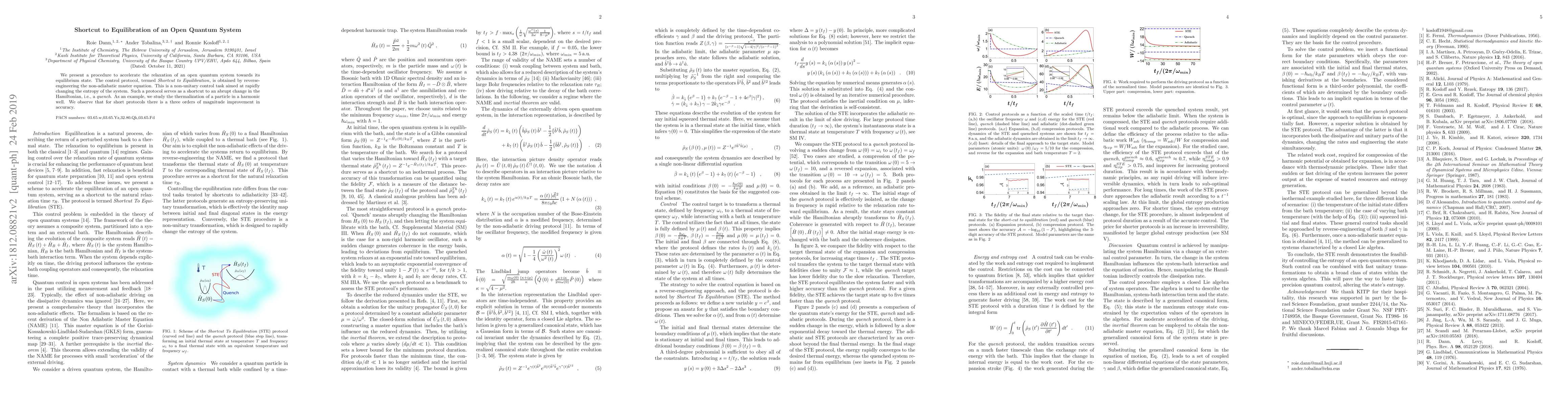 We present a procedure to accelerate the relaxation of an open quantum system towards its equilibrium state. The control protocol, termed Shortcut to Equilibration, is obtained by reverse-engineering the non-adiabatic master equation. This is a non-unitary control task aimed at rapidly changing the entropy of the system. Such a protocol serves as a shortcut to an abrupt change in the Hamiltonian, i.e., a quench. As an example, we study the thermalization of a particle in a harmonic well. We observe that for short protocols there is a three orders of magnitude improvement in accuracy.