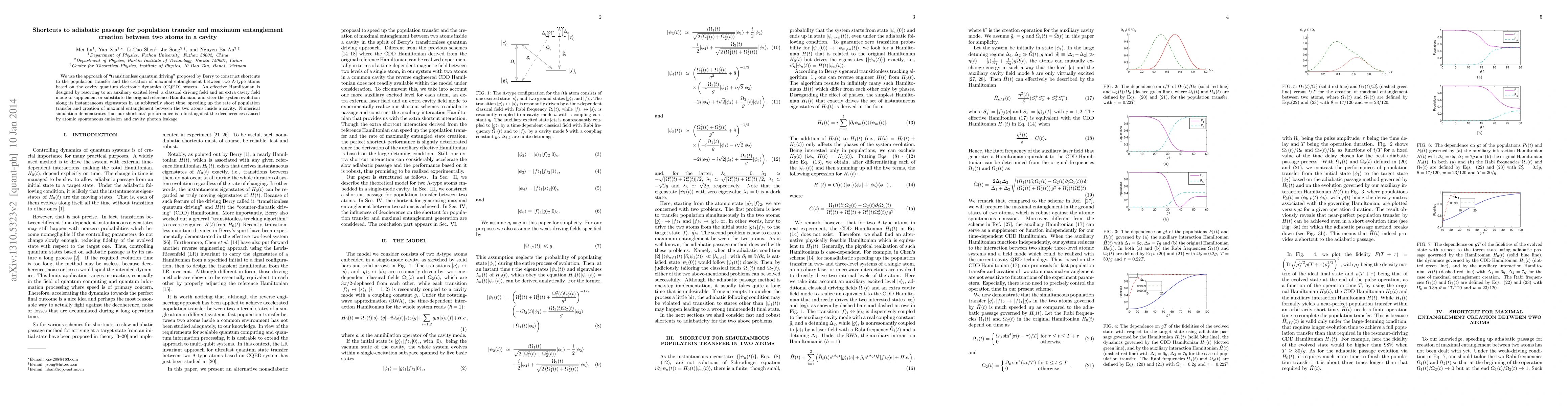 We use the approach of "transitionless quantum driving" proposed by Berry to construct shortcuts to the population transfer and the creation of maximal entanglement between two $\Lambda $-type atoms based on the cavity quantum electronic dynamics (CQED) system. An effective Hamiltonian is designed by resorting to an auxiliary excited level, a classical driving field and an extra cavity field mode to supplement or substitute the original reference Hamiltonian, and steer the system evolution along its instantaneous eigenstates in an arbitrarily short time, speeding up the rate of population transfer and creation of maximal entanglement between the two atoms inside a cavity. Numerical simulation demonstrates that our shortcuts' performance is robust against the decoherences caused by atomic spontaneous emission and cavity photon leakage.