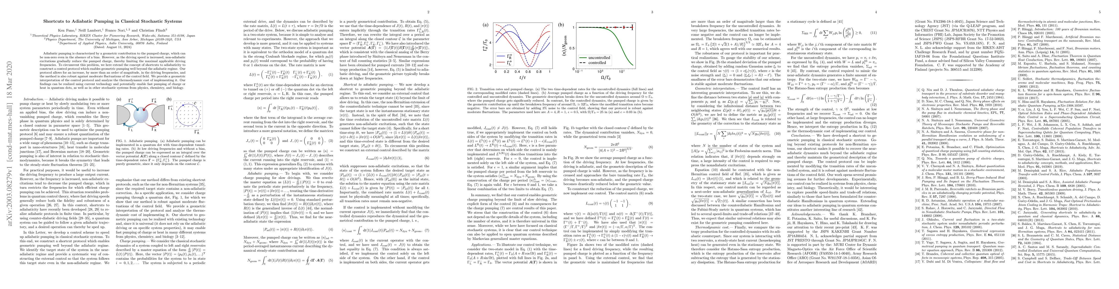 This paper proposes a control protocol that extends the concept of shortcuts to adiabaticity, enabling geometric pumping in classical stochastic systems at significantly higher driving frequencies than traditional methods. The protocol is robust against moderate fluctuations and can potentially facilitate fast charge or heat pumping in quantum dots and other systems.